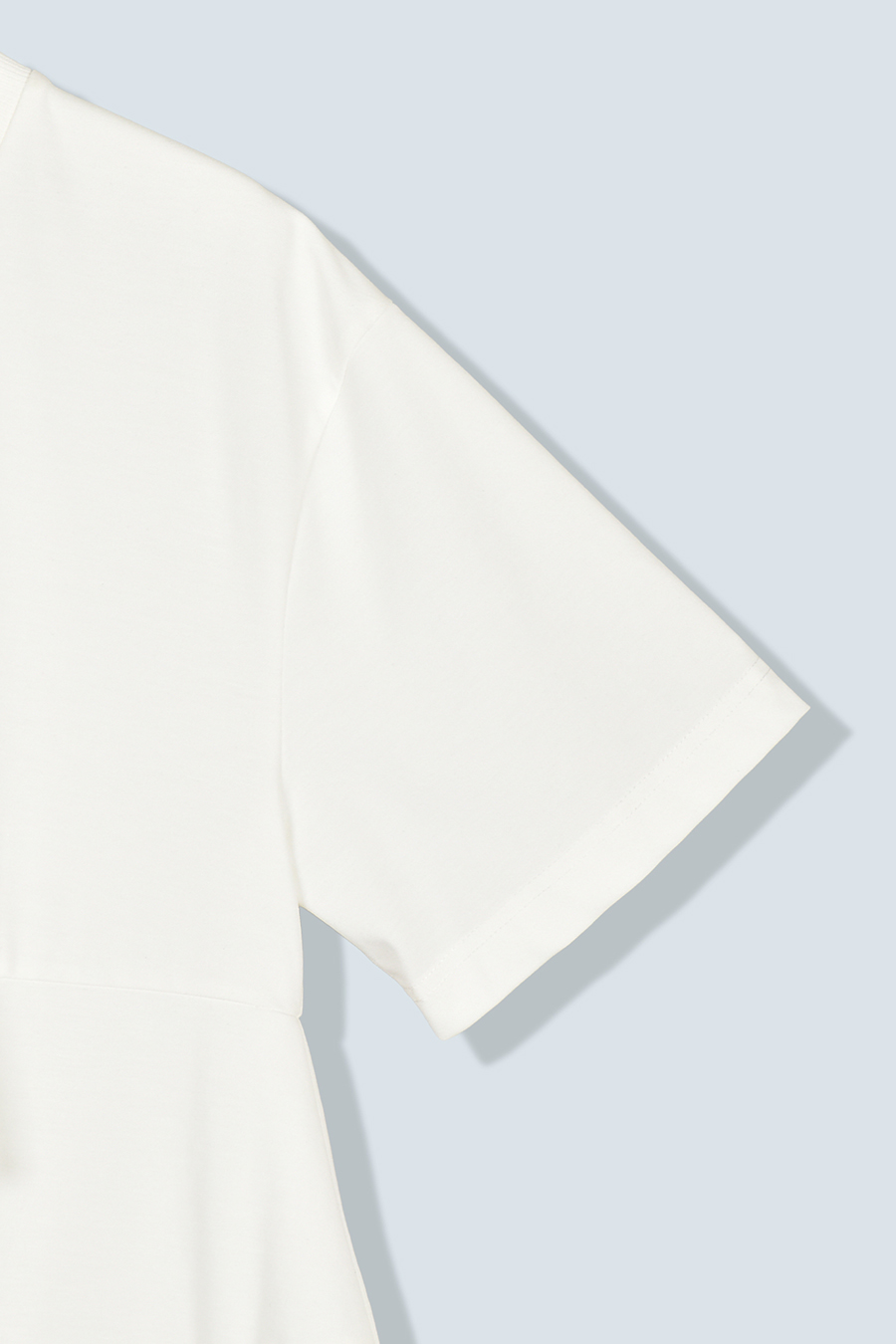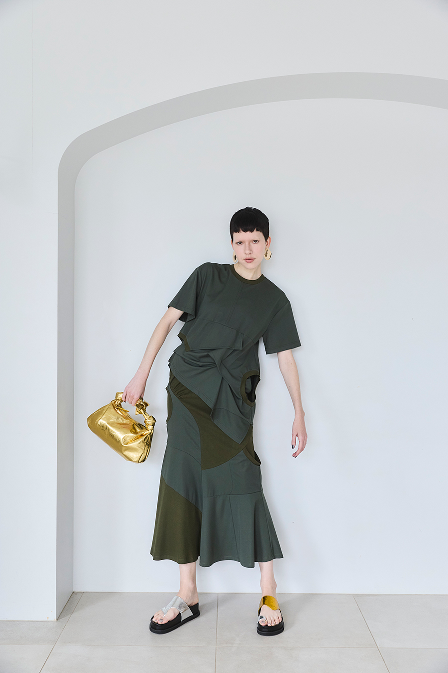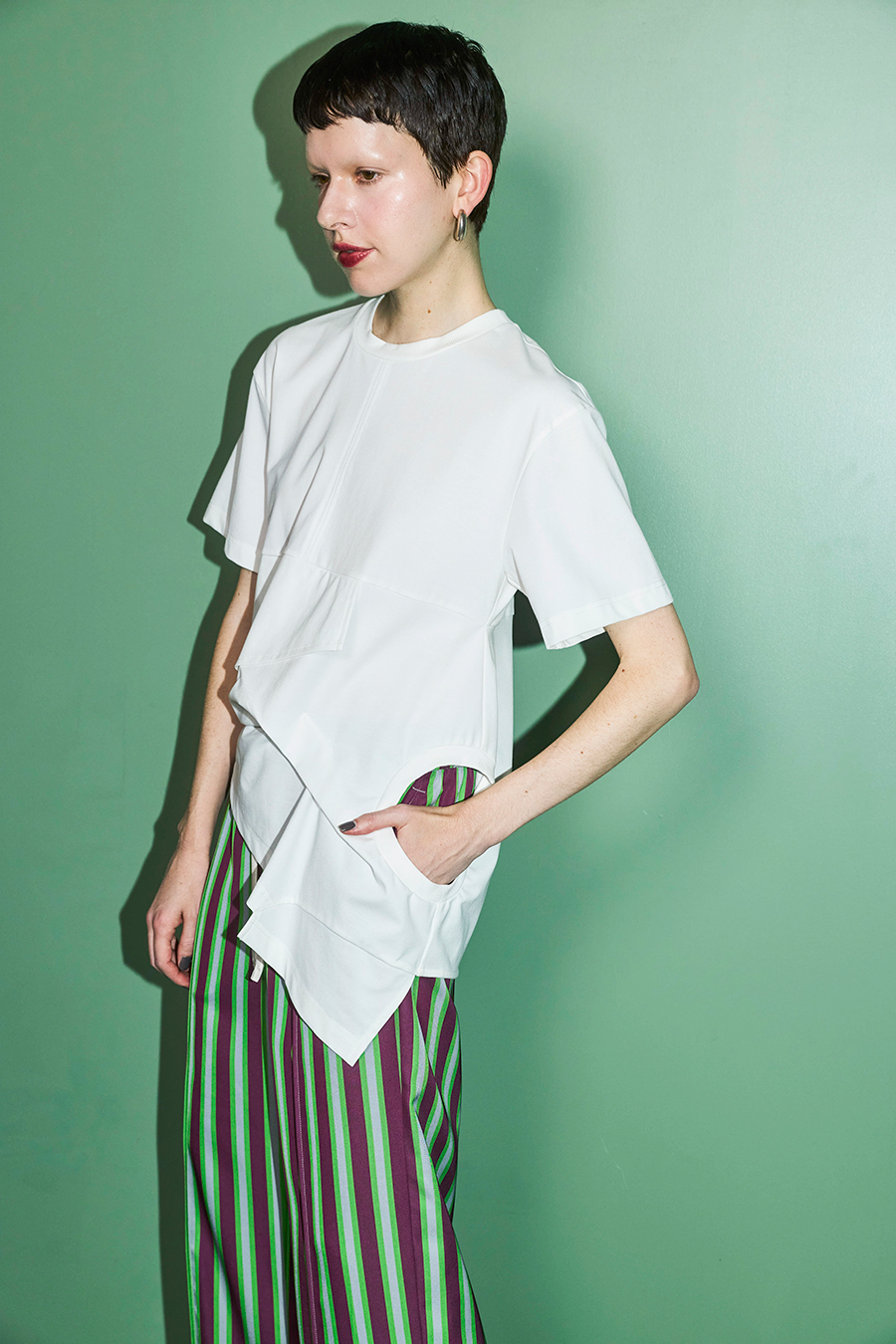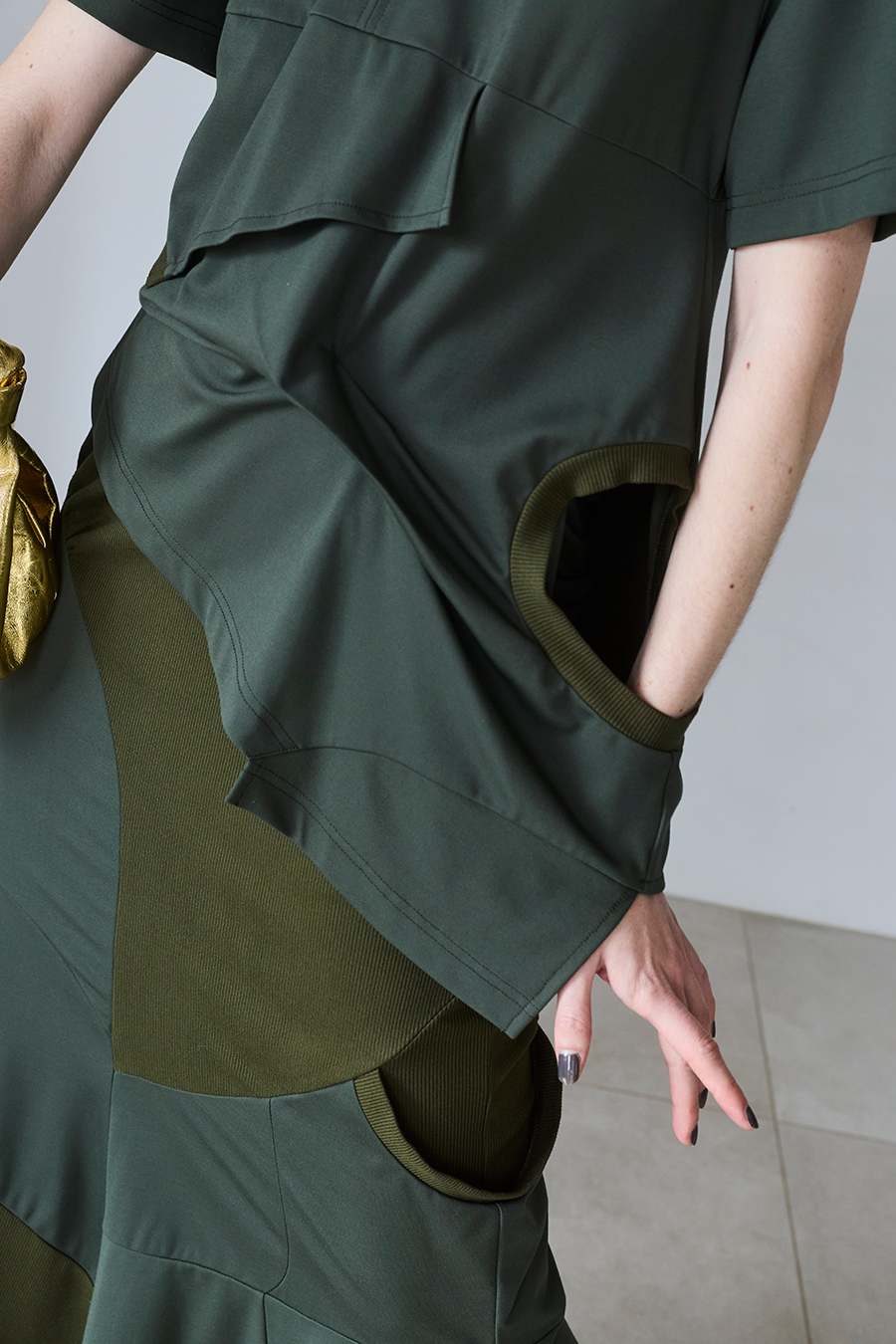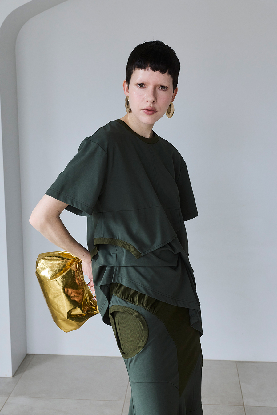 Tシャツを解体して再構築したようなデザインが印象的なトップス。長めの袖丈と胸下の切り替えに配したレイヤードパーツが、気になる部分をさりげなくカバーしてくれます。