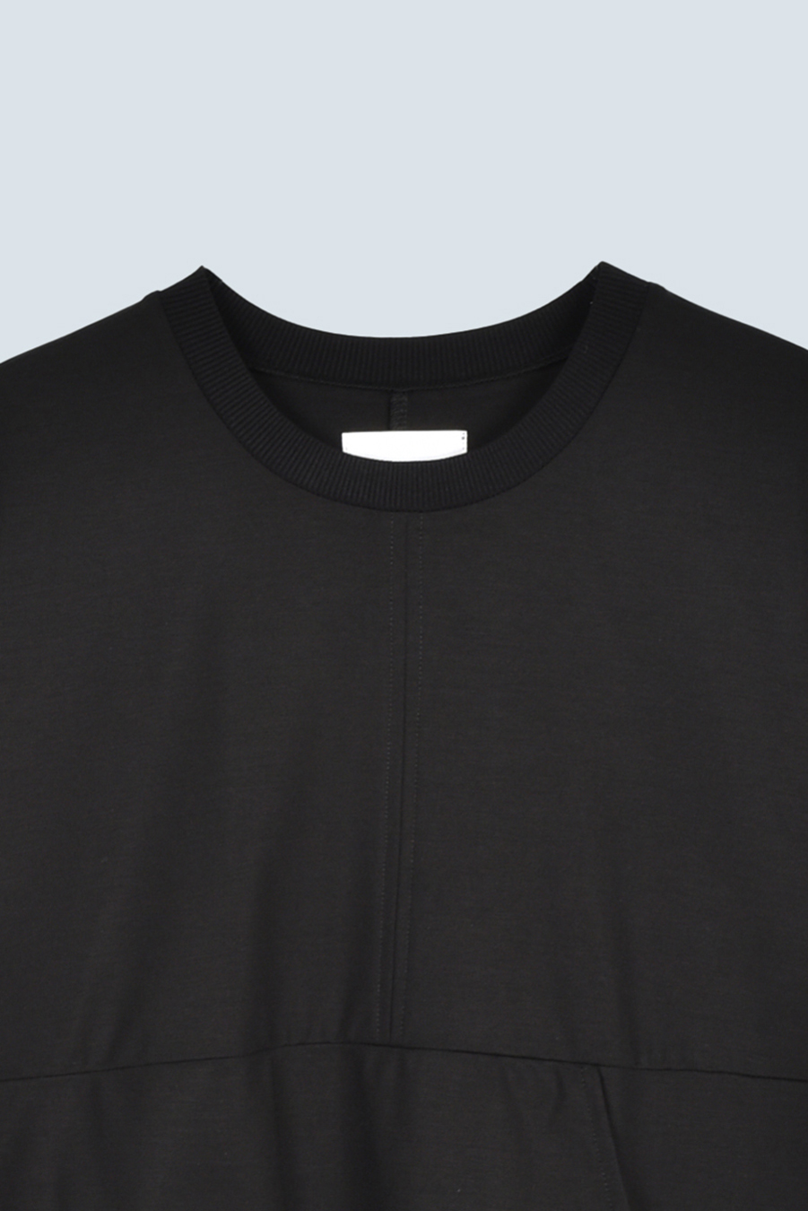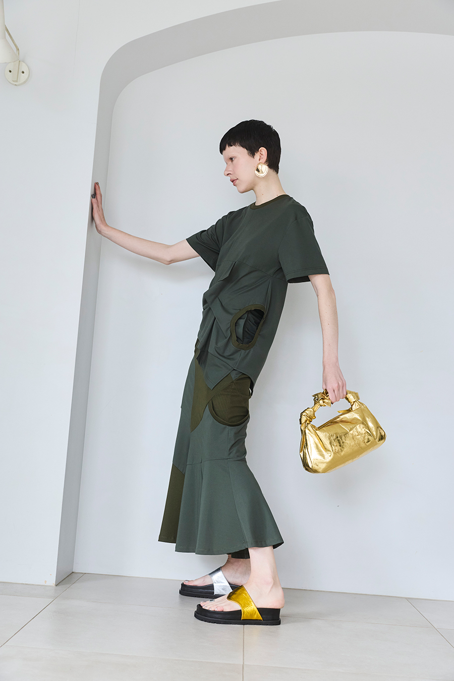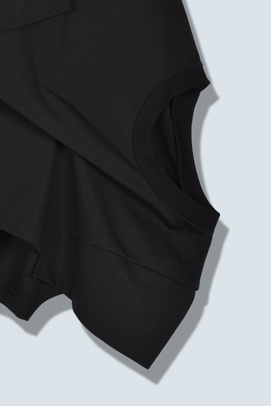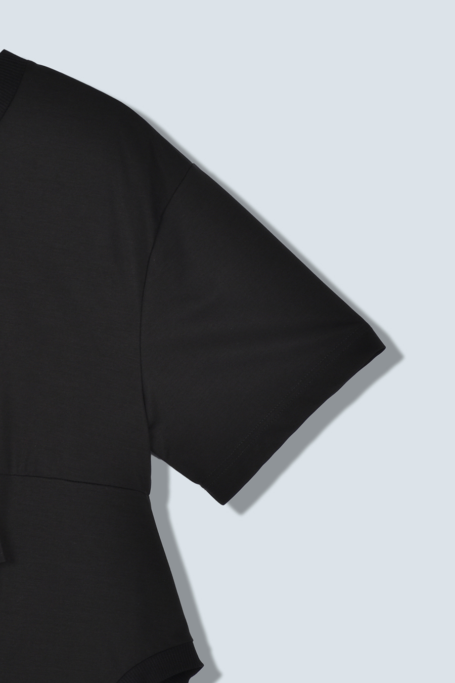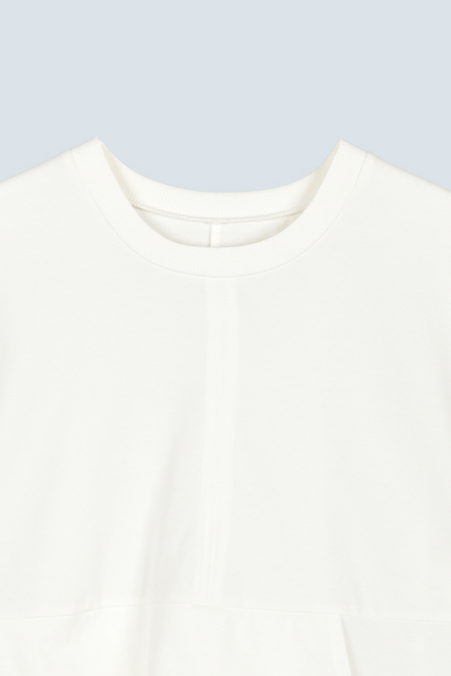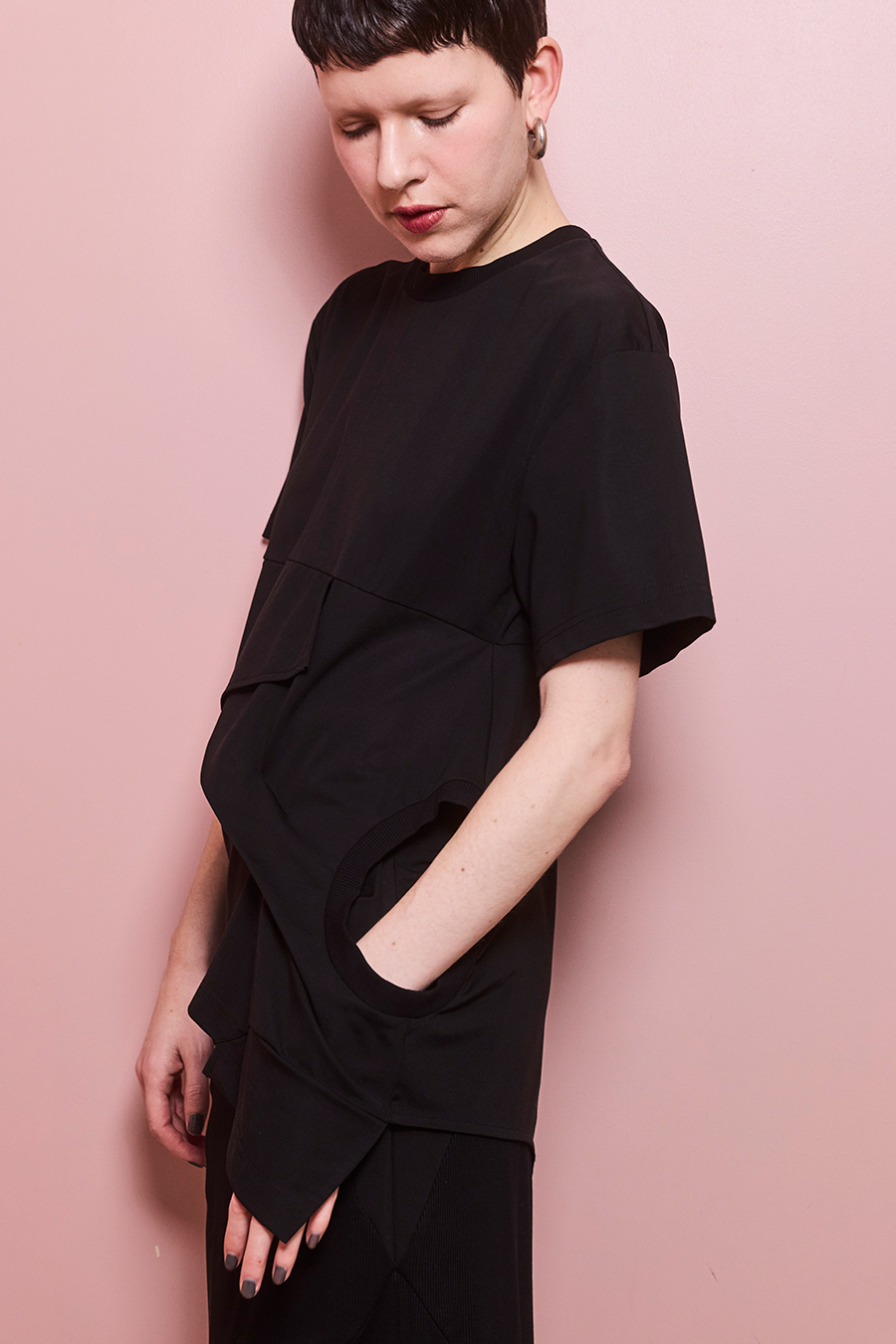 Tシャツを解体して再構築したようなデザインが印象的なトップス。長めの袖丈と胸下の切り替えに配したレイヤードパーツが、気になる部分をさりげなくカバーしてくれます。