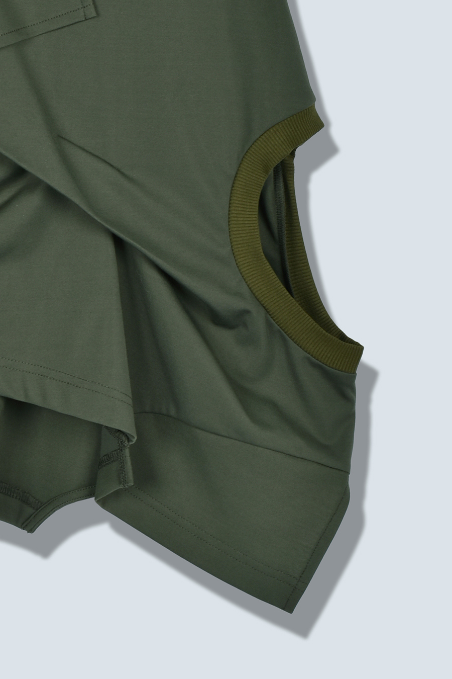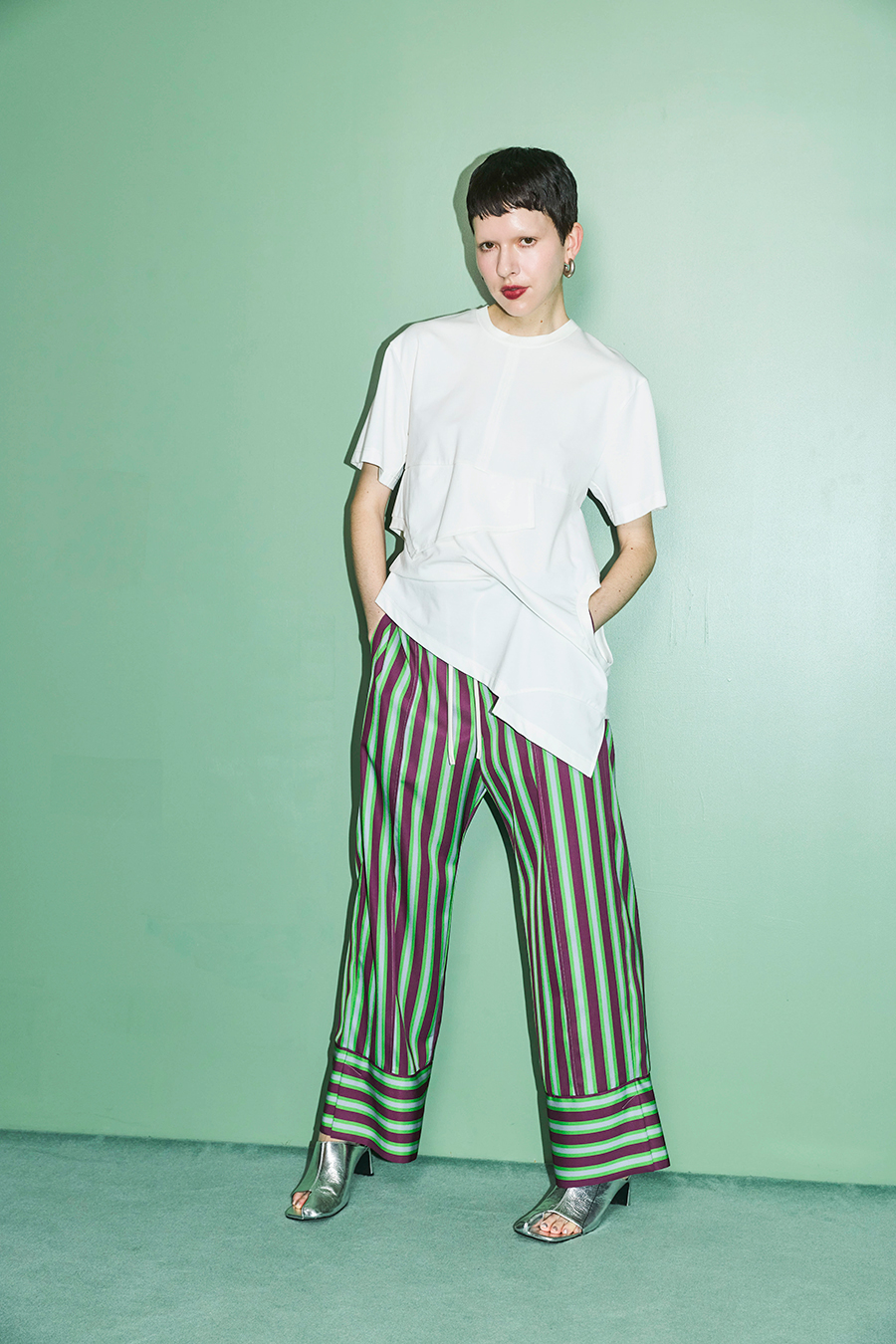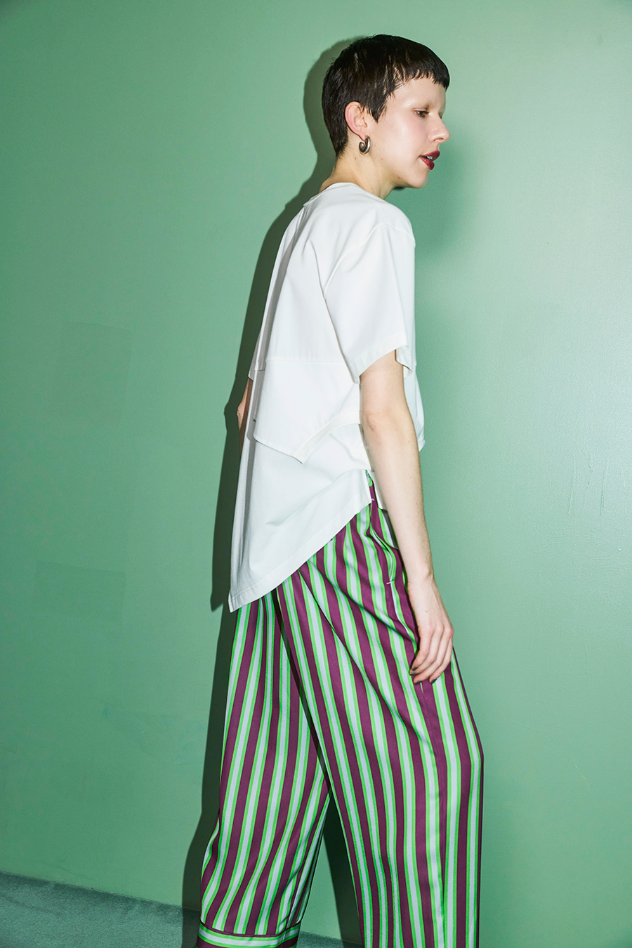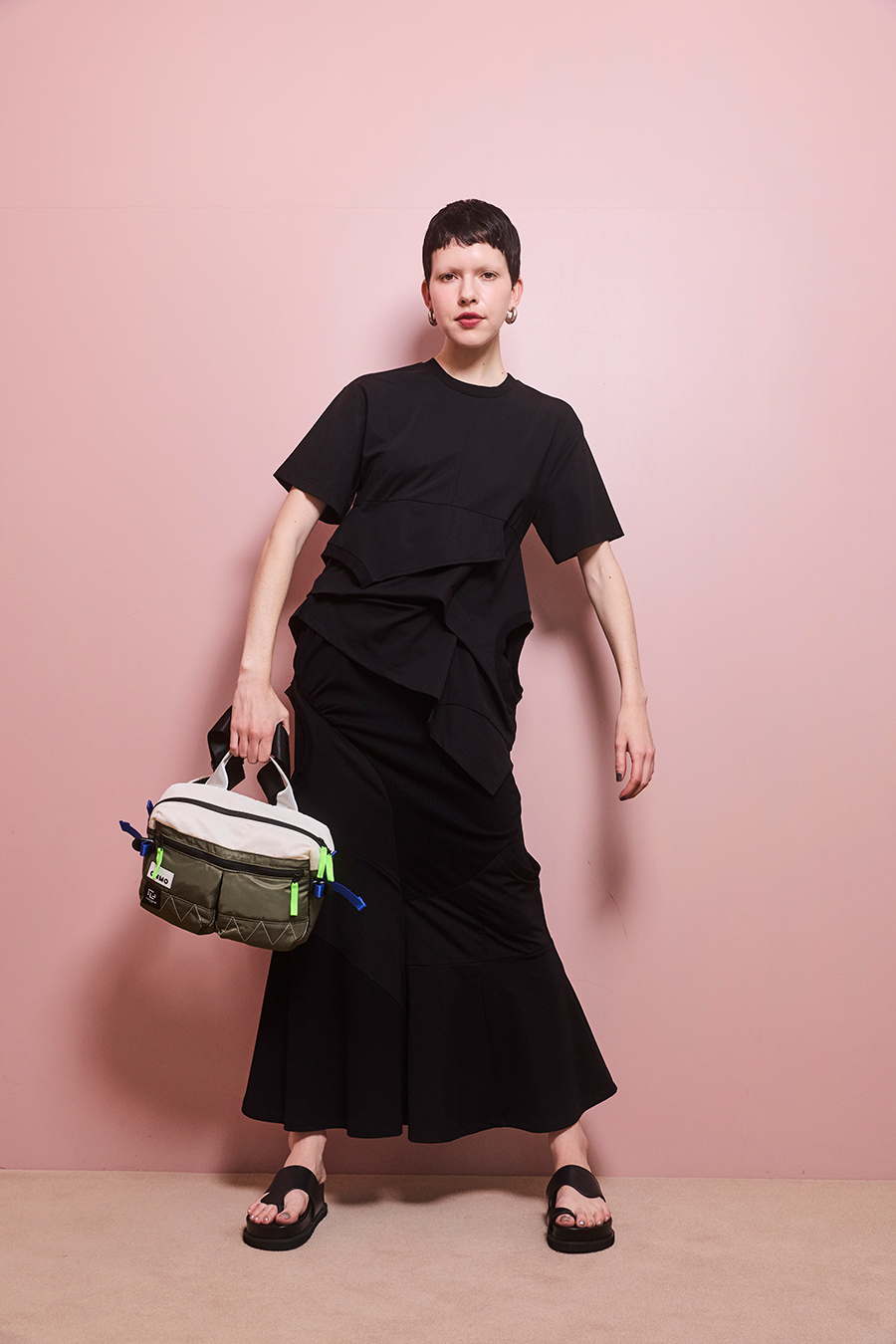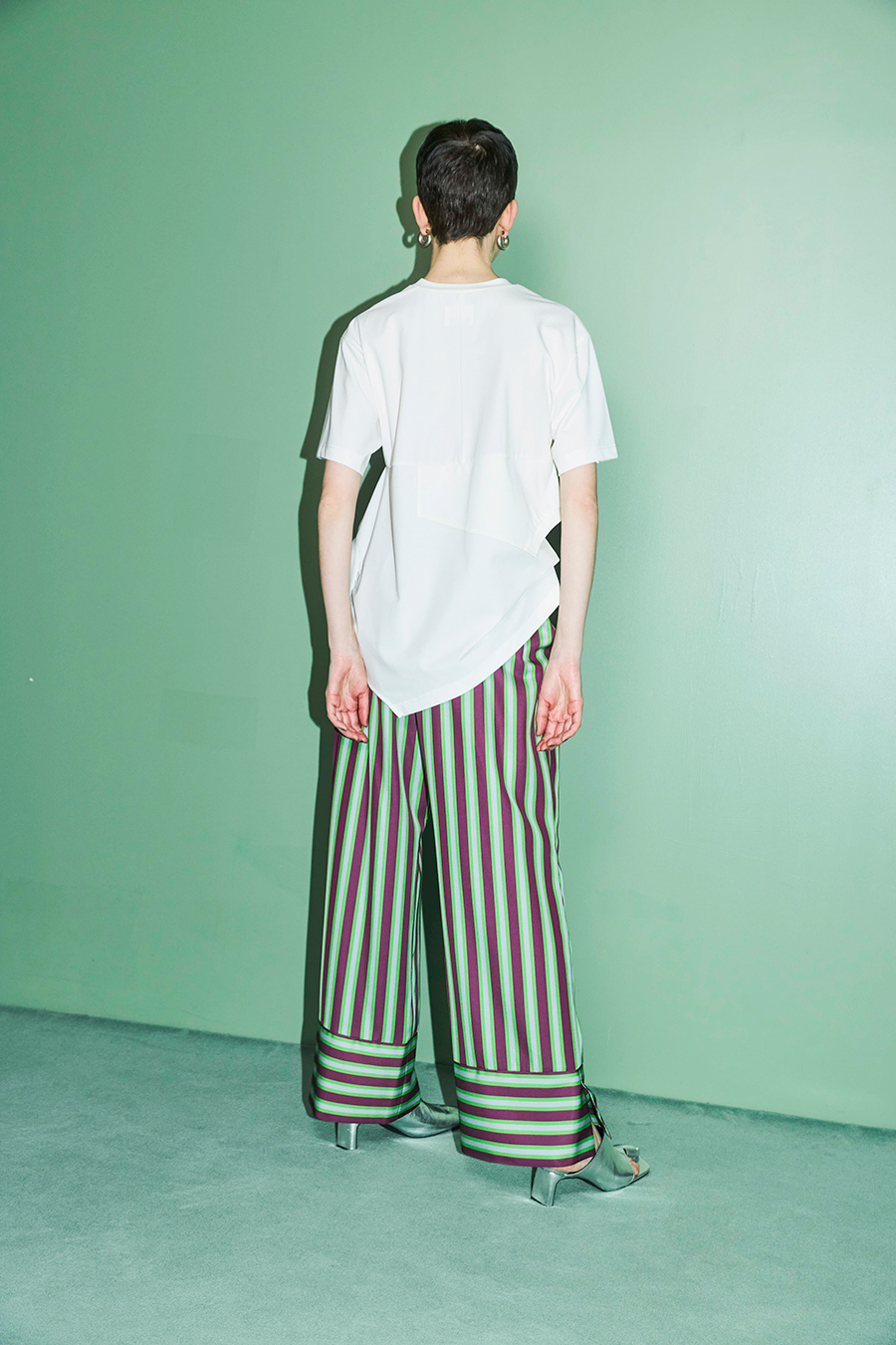 Tシャツを解体して再構築したようなデザインが印象的なトップス。長めの袖丈と胸下の切り替えに配したレイヤードパーツが、気になる部分をさりげなくカバーしてくれます。