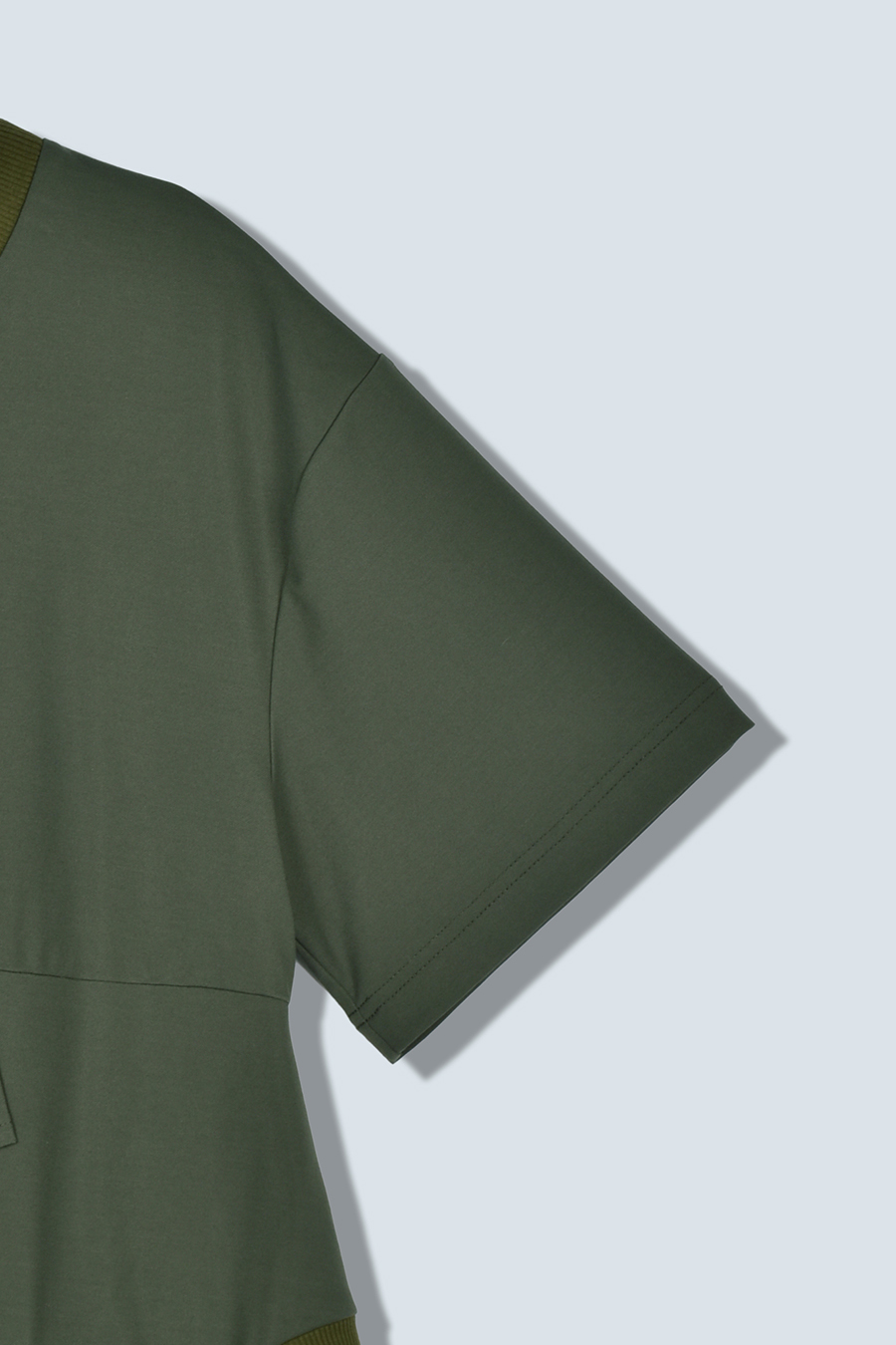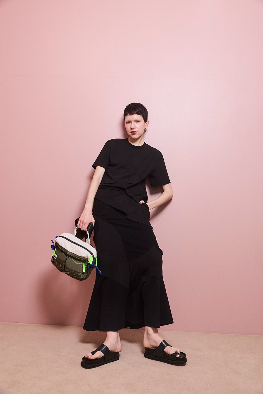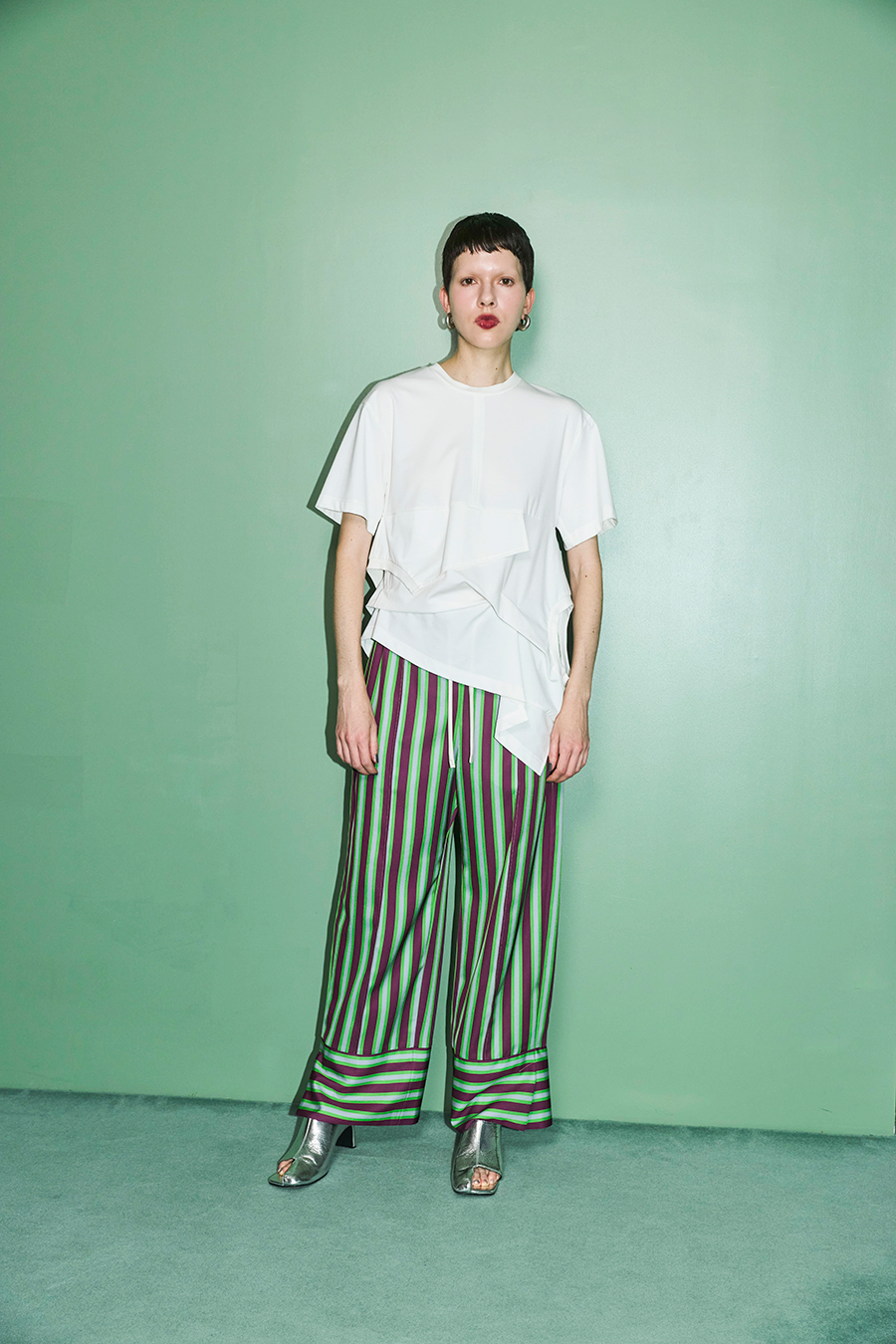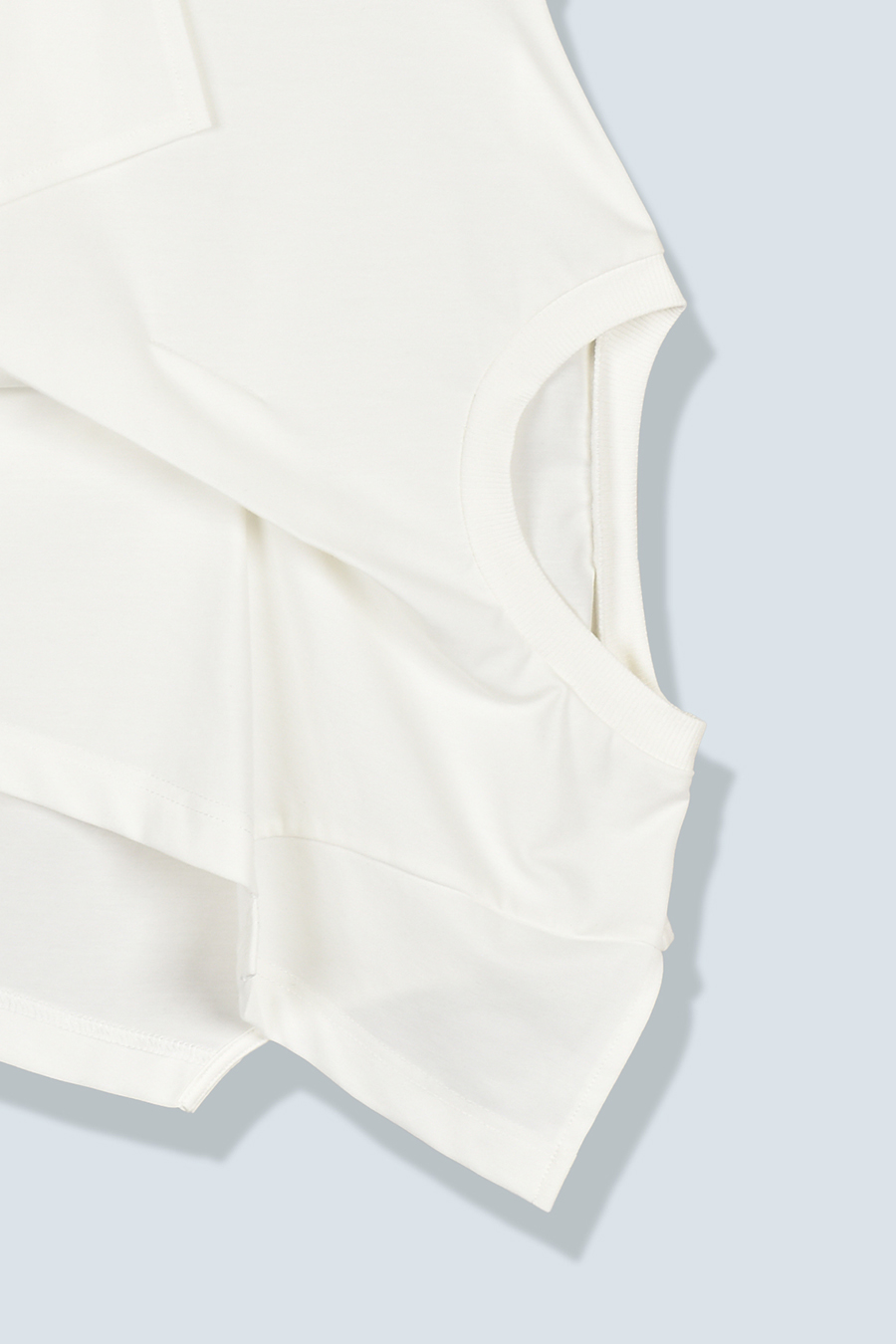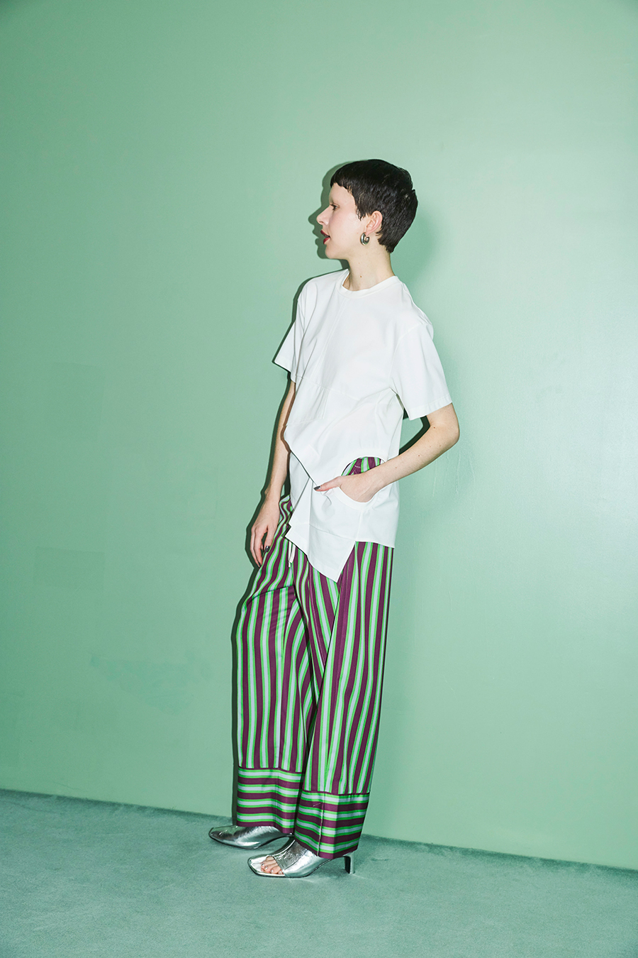Tシャツを解体して再構築したようなデザインが印象的なトップス。長めの袖丈と胸下の切り替えに配したレイヤードパーツが、気になる部分をさりげなくカバーしてくれます。