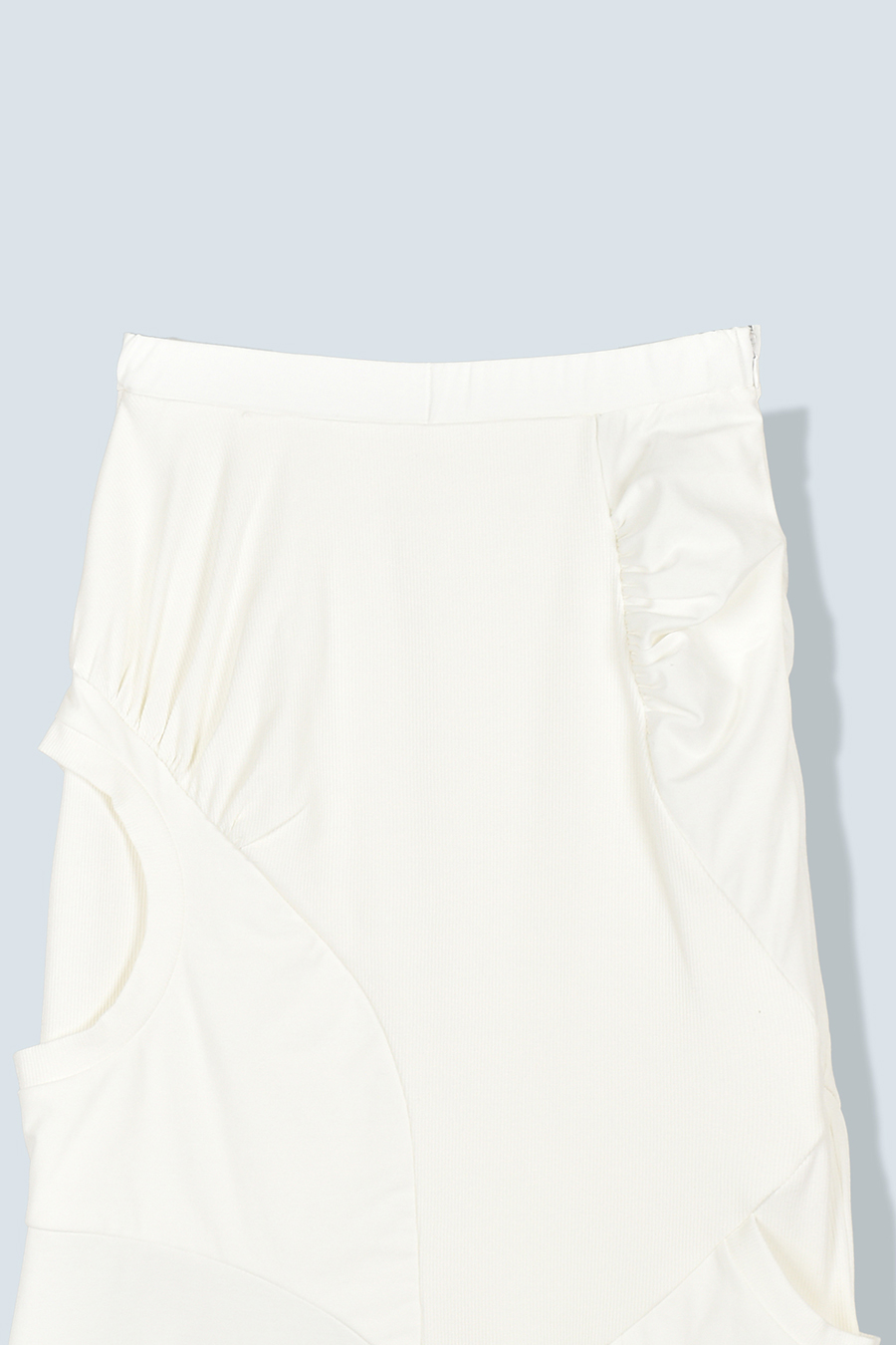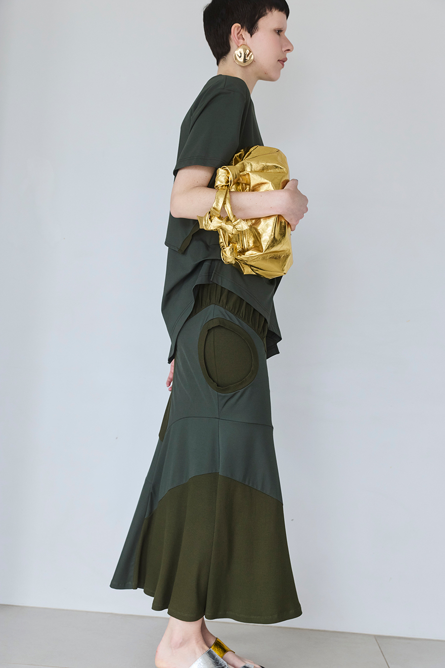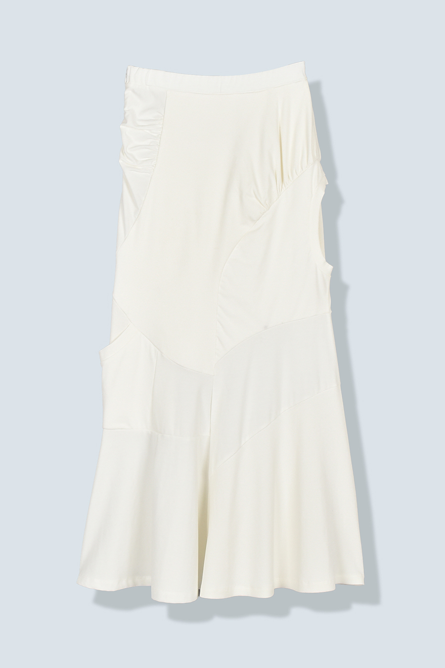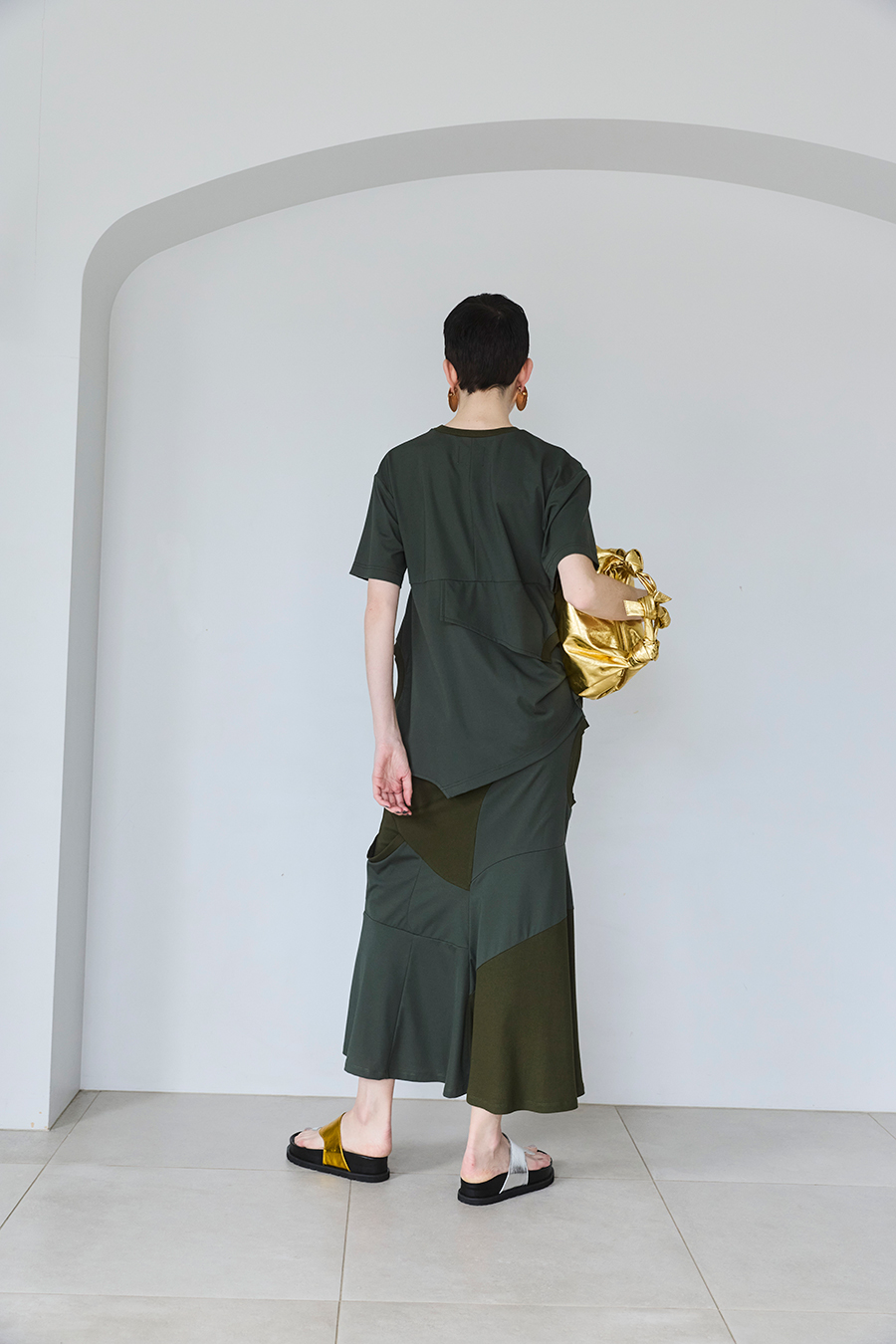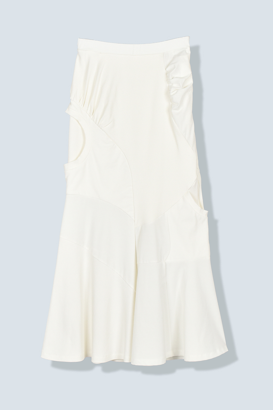 Tシャツを解体して再構築したようなデザインのカットソースカート。カジュアルなデザインながらも、マーメイドシルエットがほどよい女性らしい印象を演出。