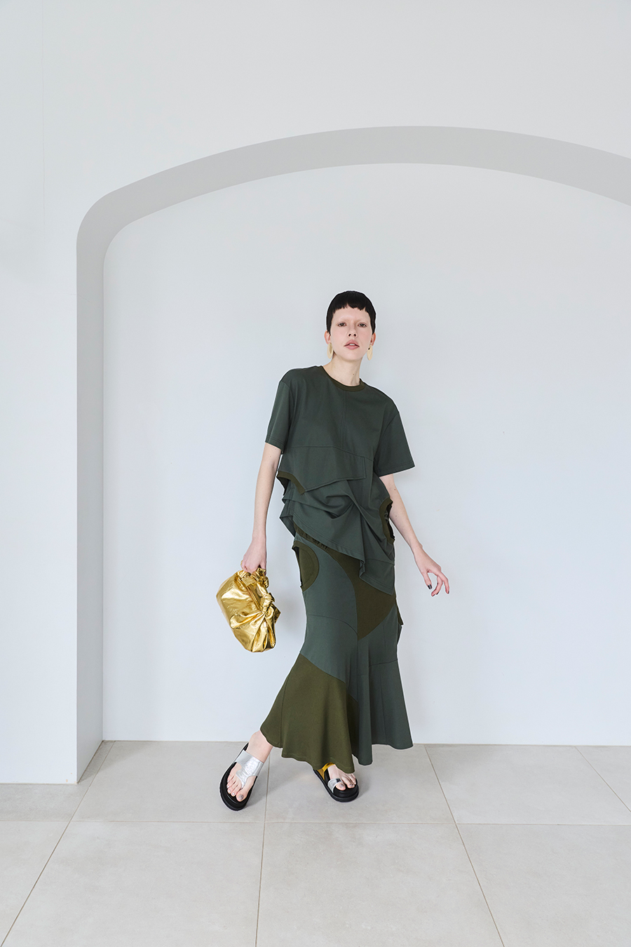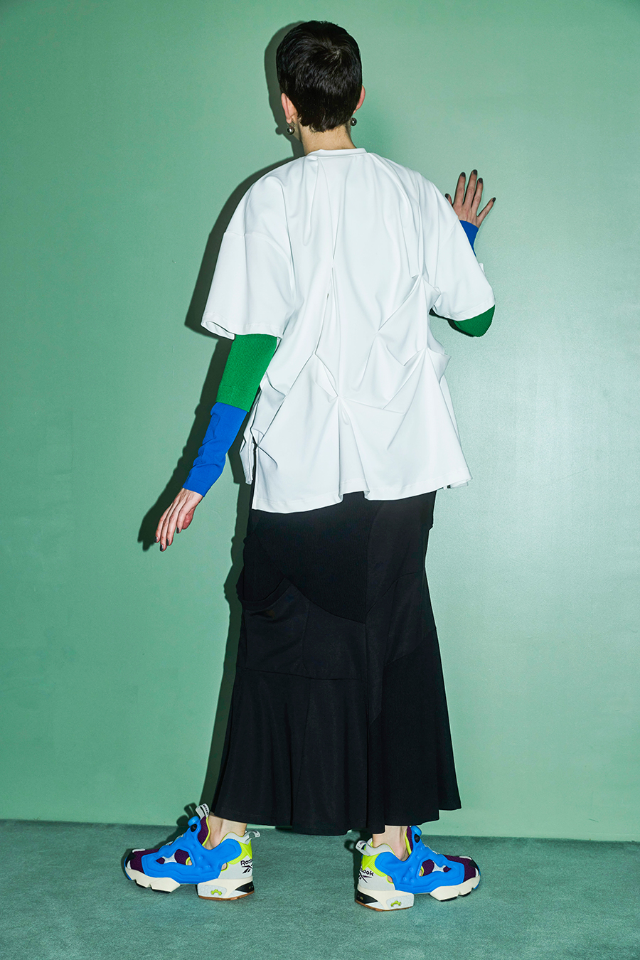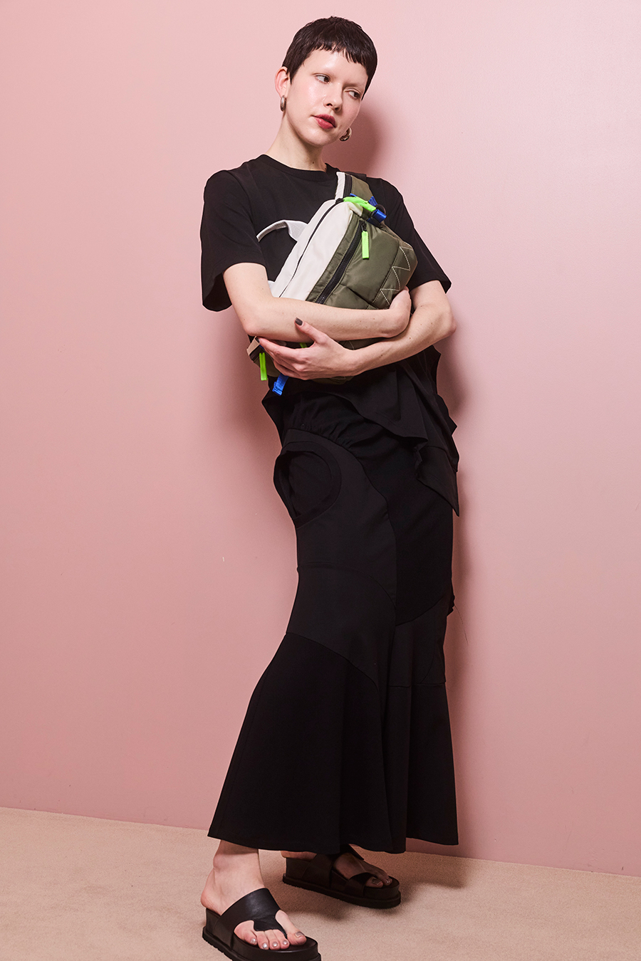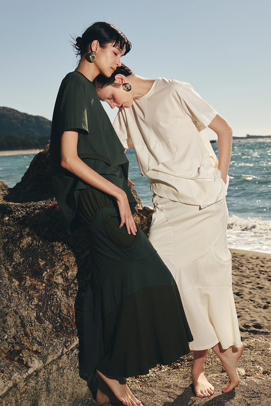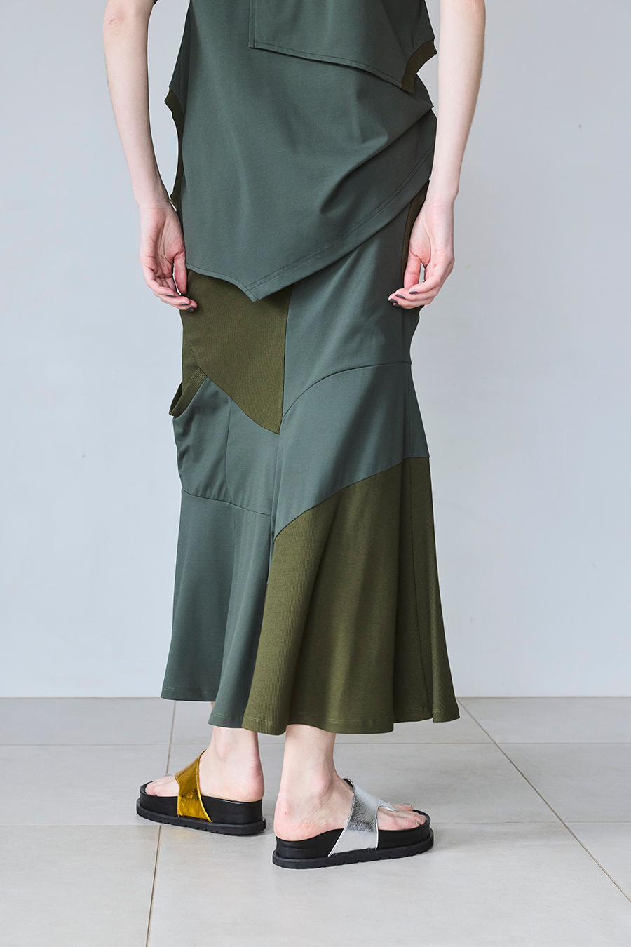 Tシャツを解体して再構築したようなデザインのカットソースカート。カジュアルなデザインながらも、マーメイドシルエットがほどよい女性らしい印象を演出。