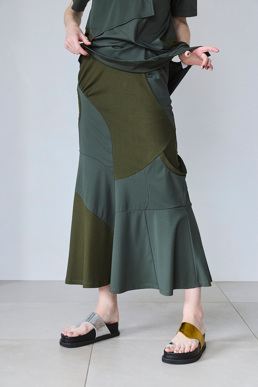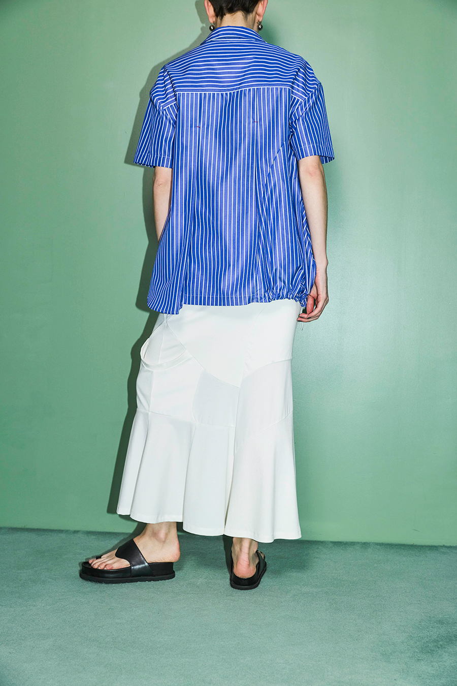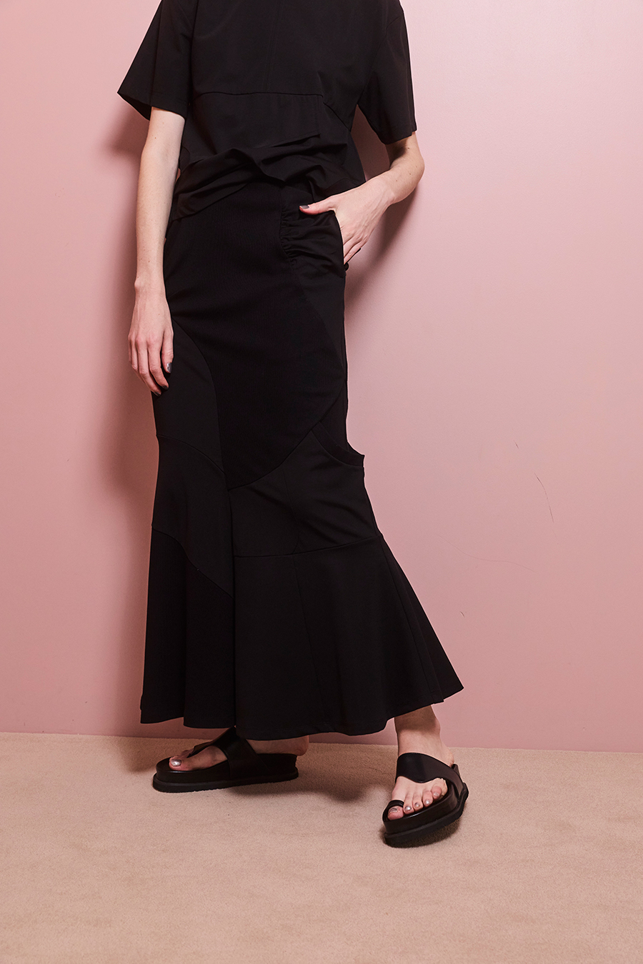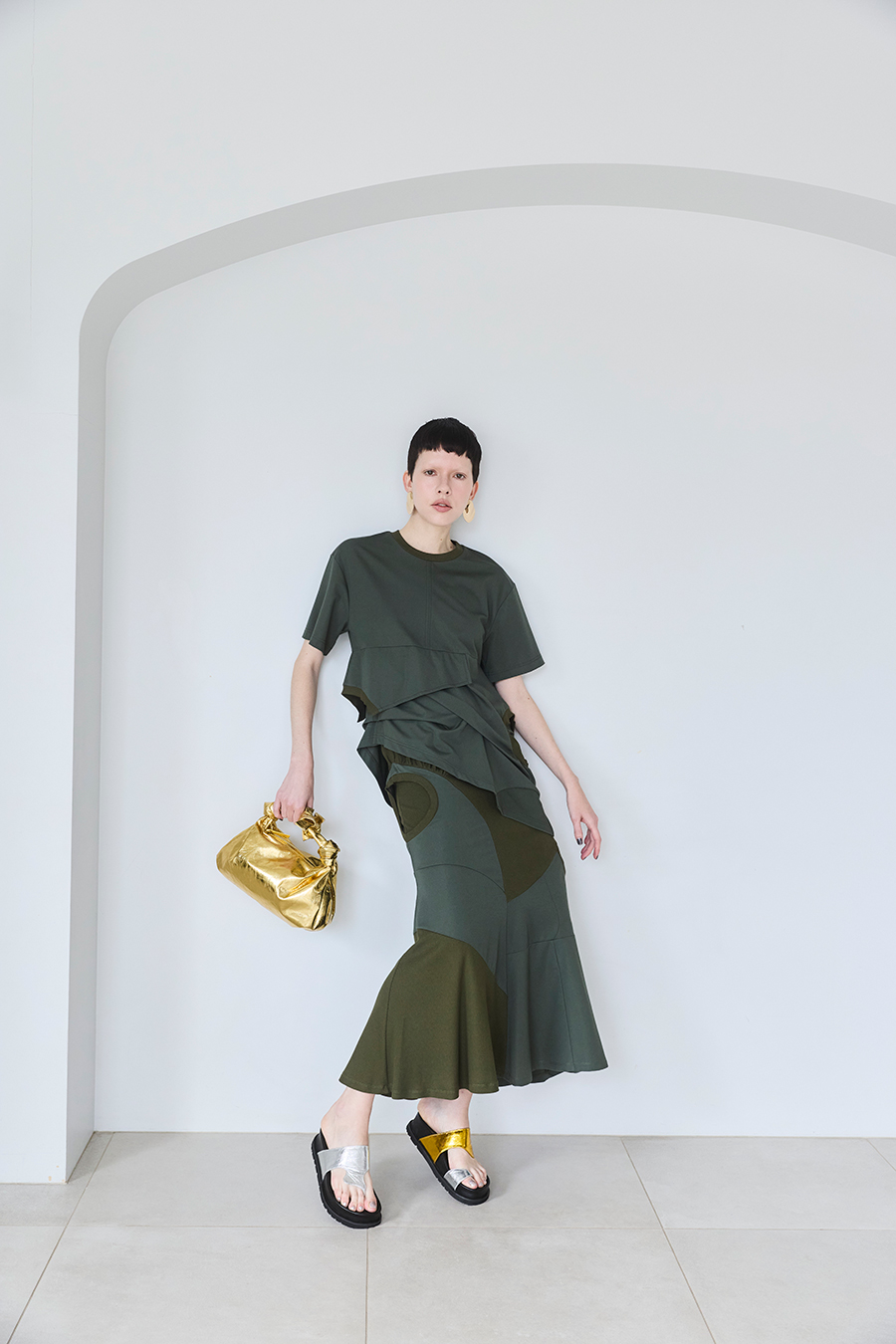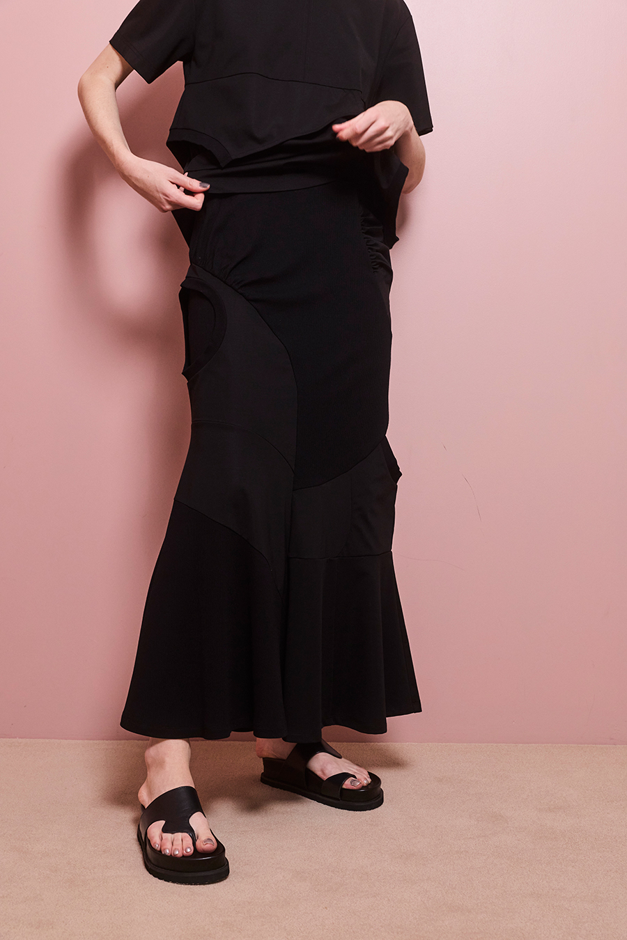 Tシャツを解体して再構築したようなデザインのカットソースカート。カジュアルなデザインながらも、マーメイドシルエットがほどよい女性らしい印象を演出。