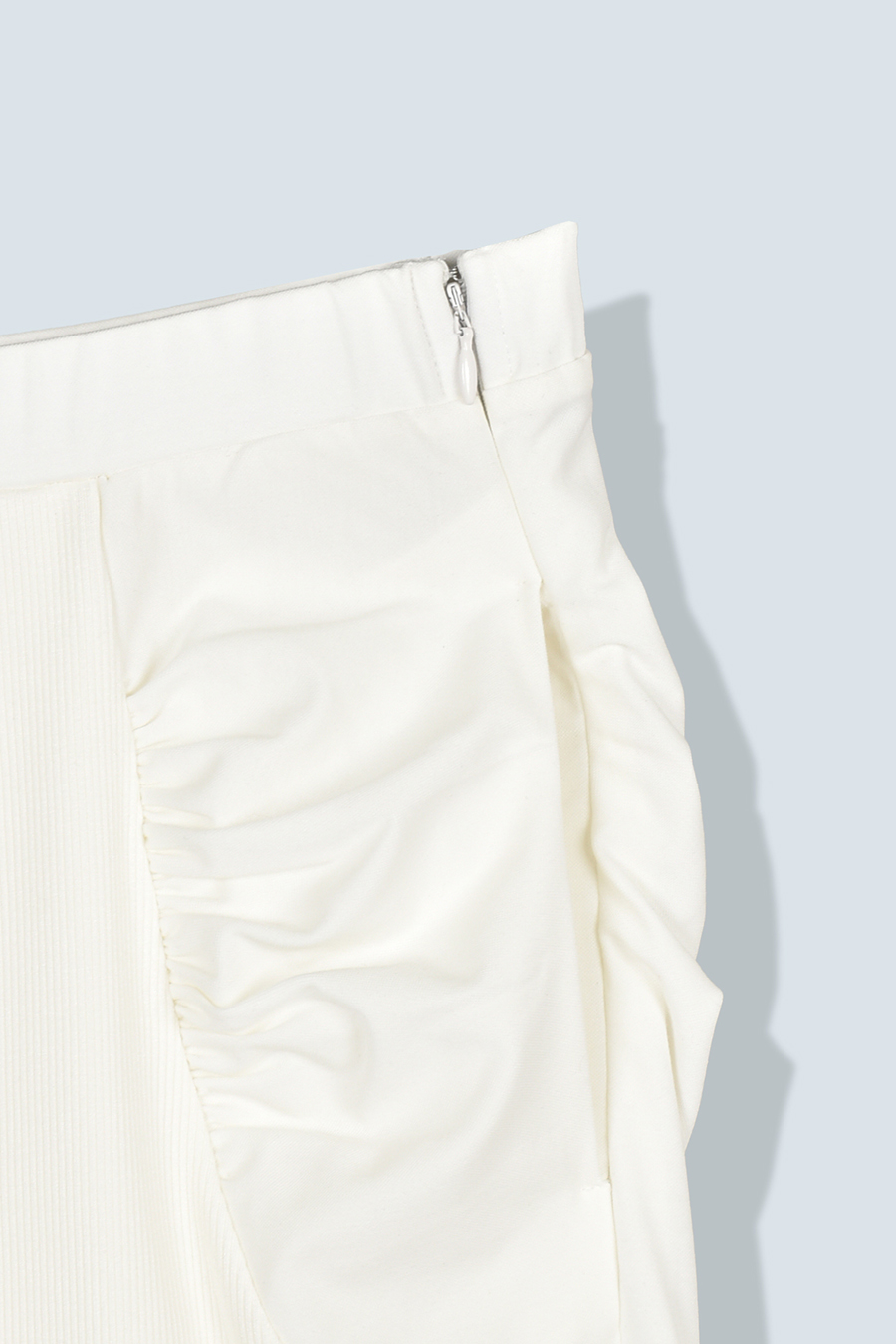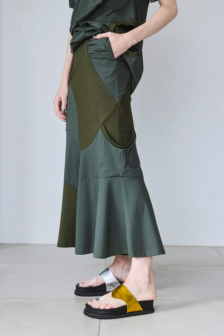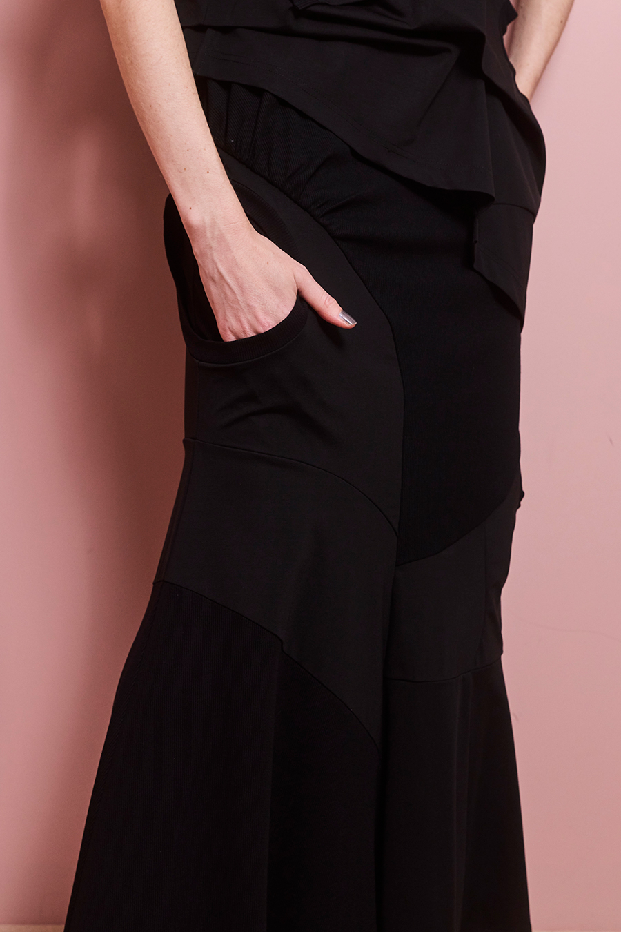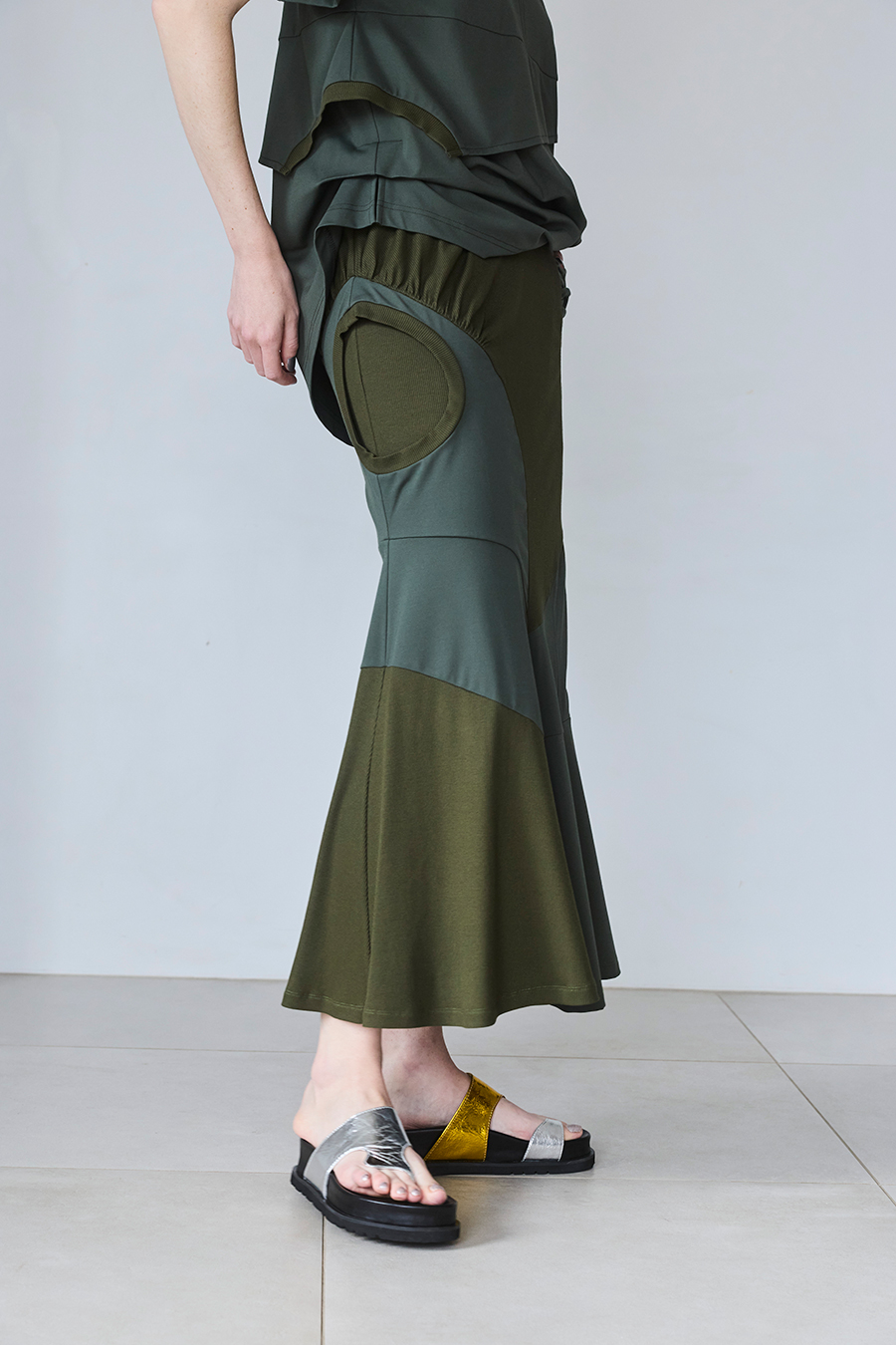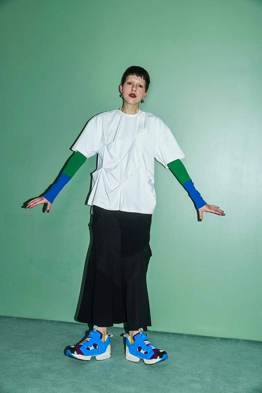 Tシャツを解体して再構築したようなデザインのカットソースカート。カジュアルなデザインながらも、マーメイドシルエットがほどよい女性らしい印象を演出。