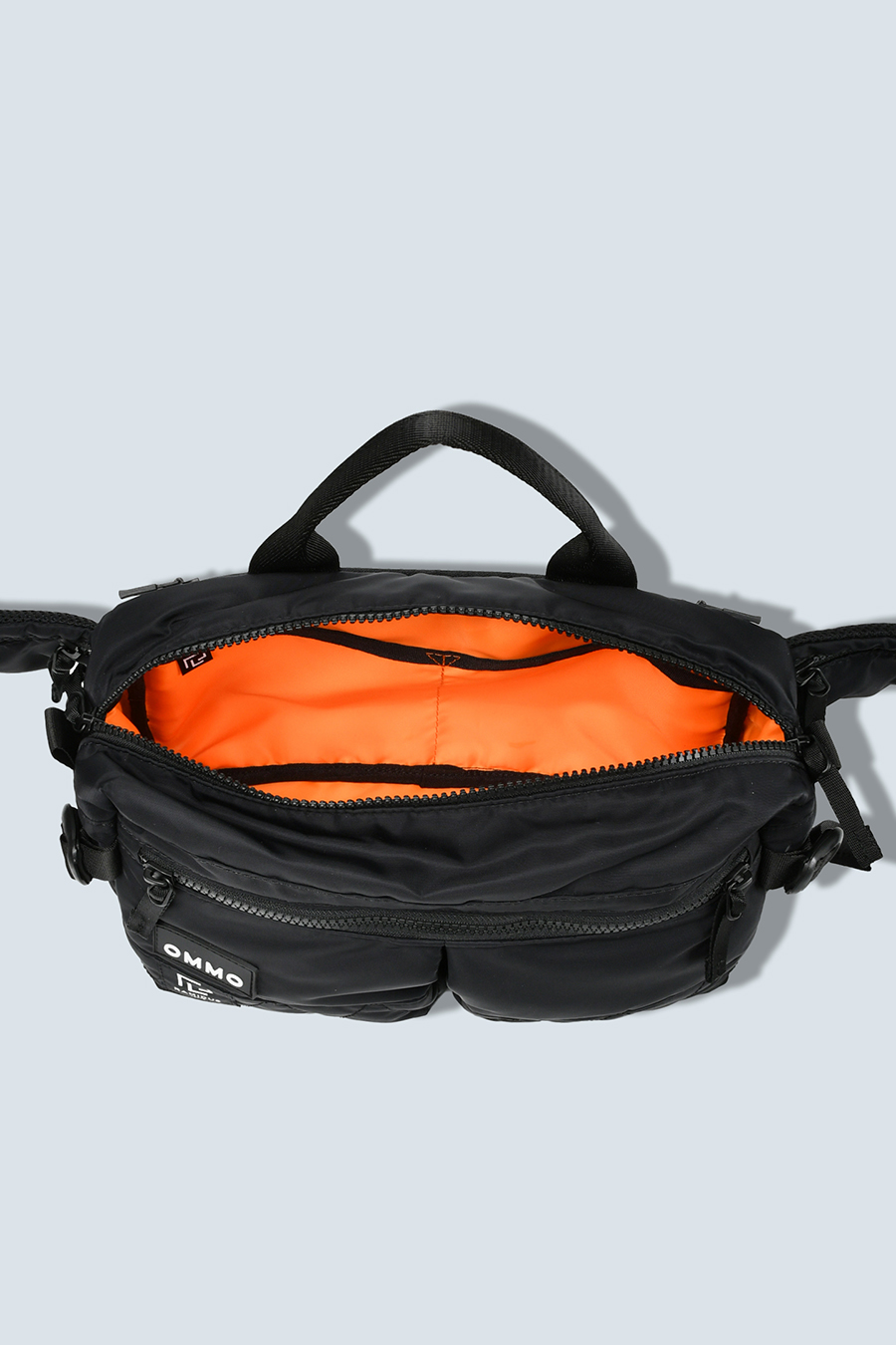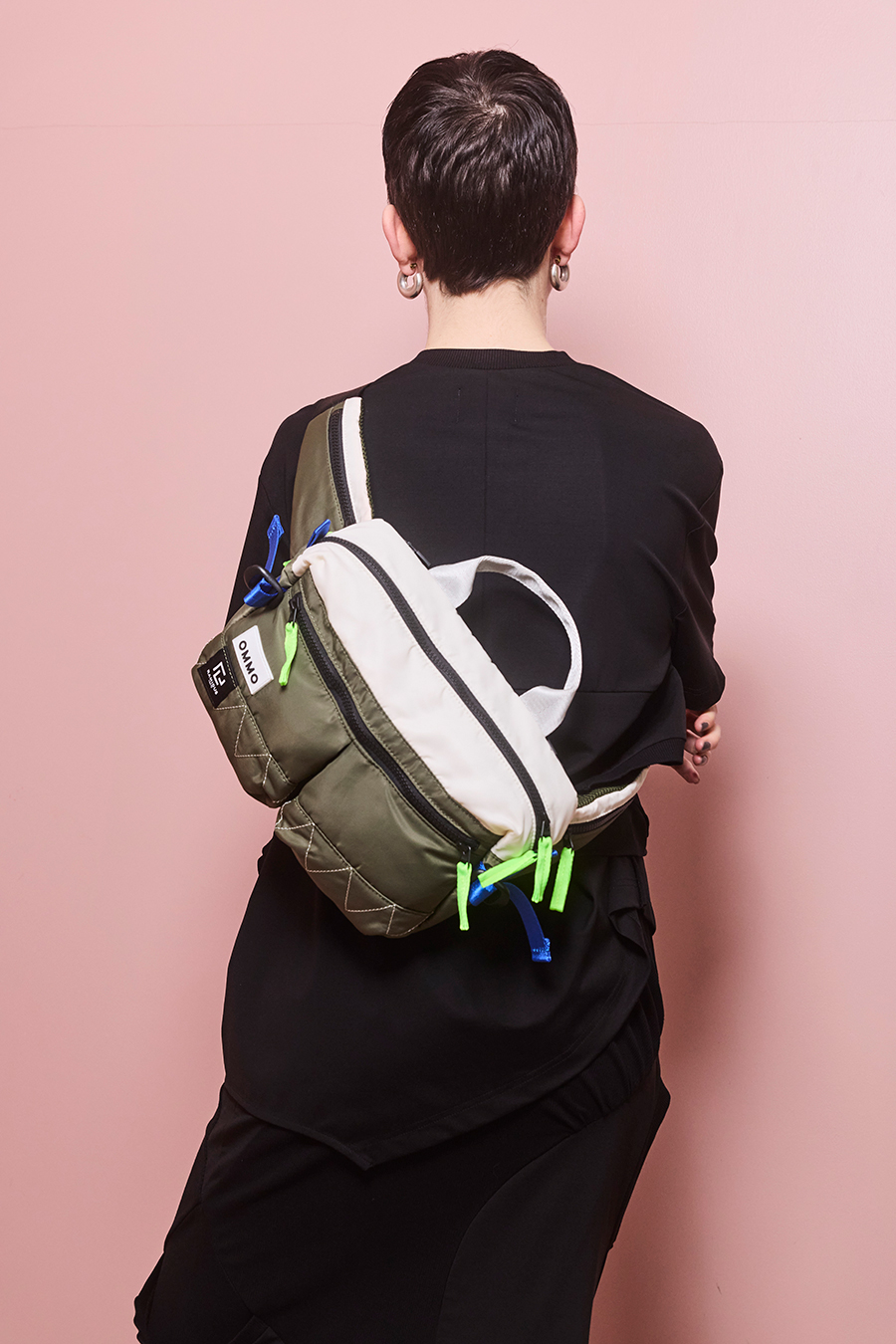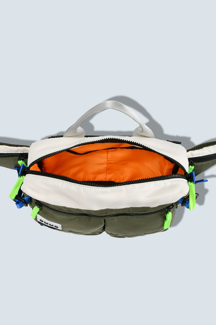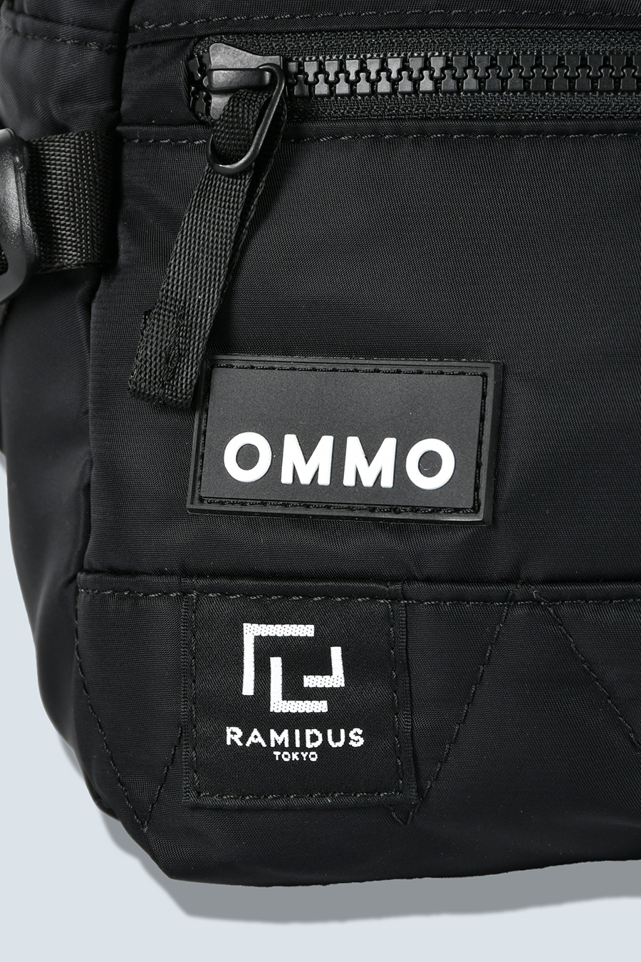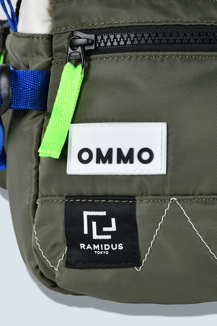 RAMIDUS×OMMOコラボレーションアイテムのウエストバッグ。フロントポケットのMA-1ディティールのステッチや、KHAKIのOMMOらしい配色がポイントになっております。