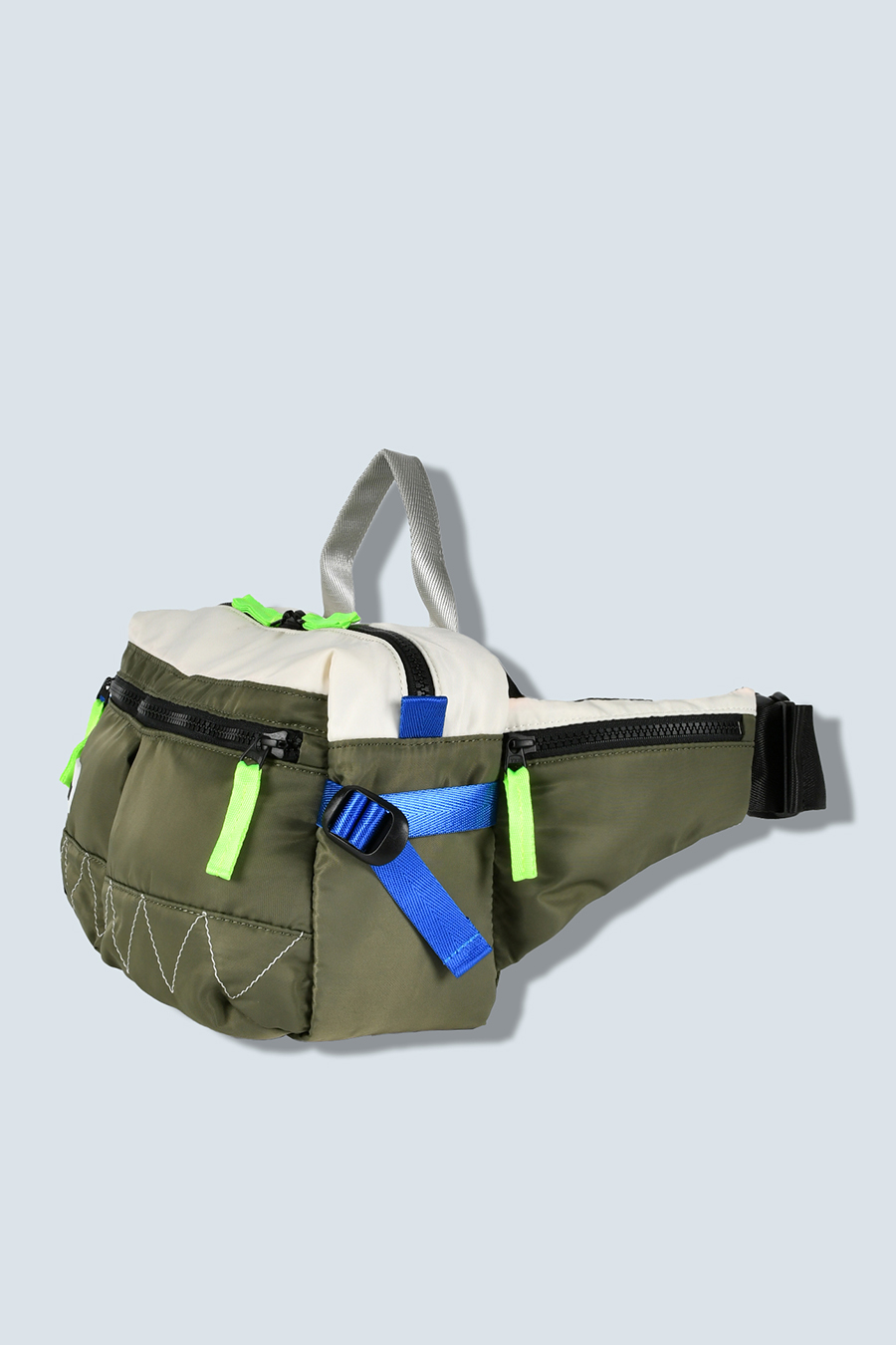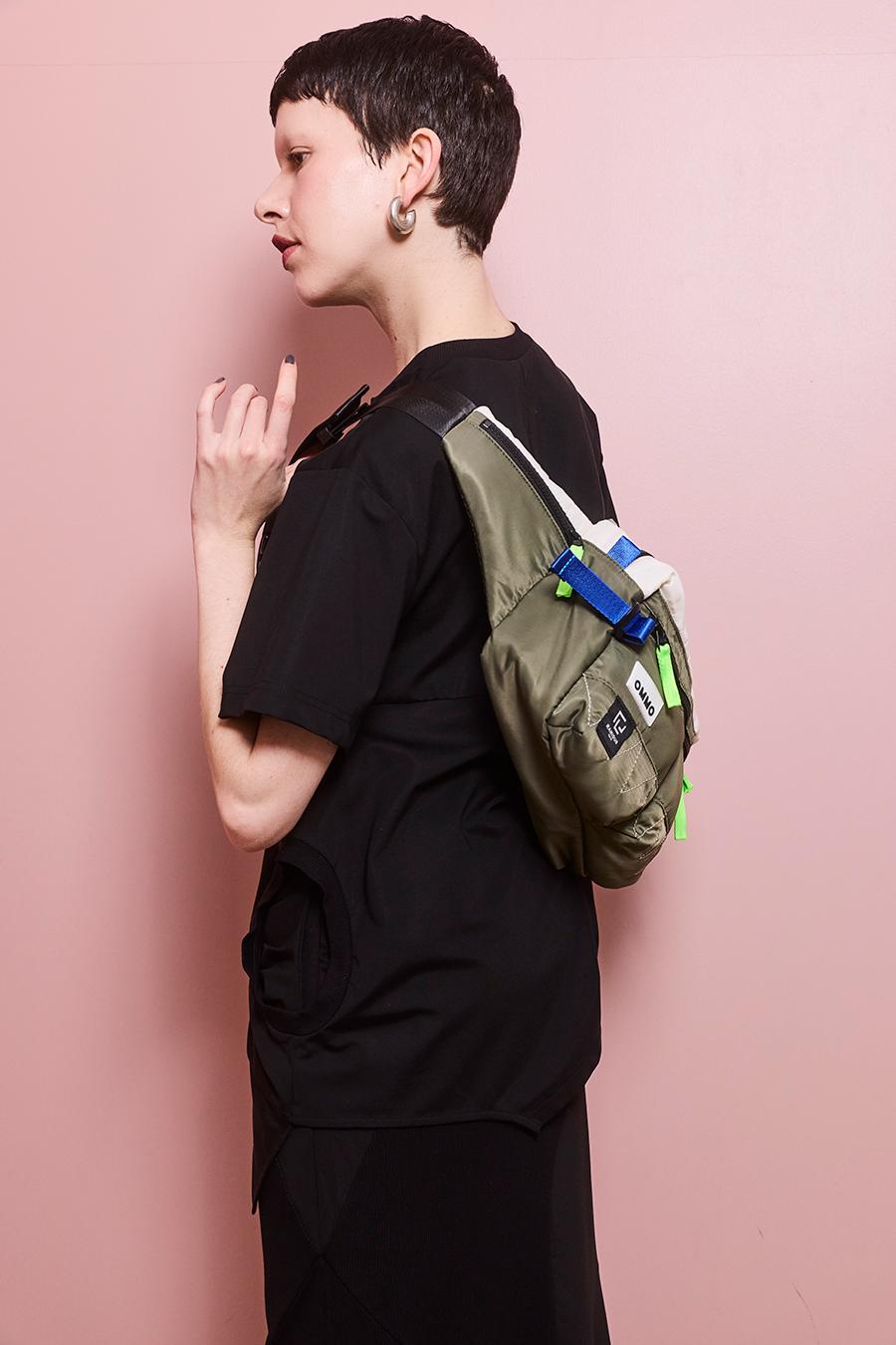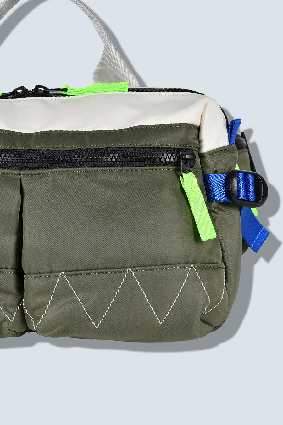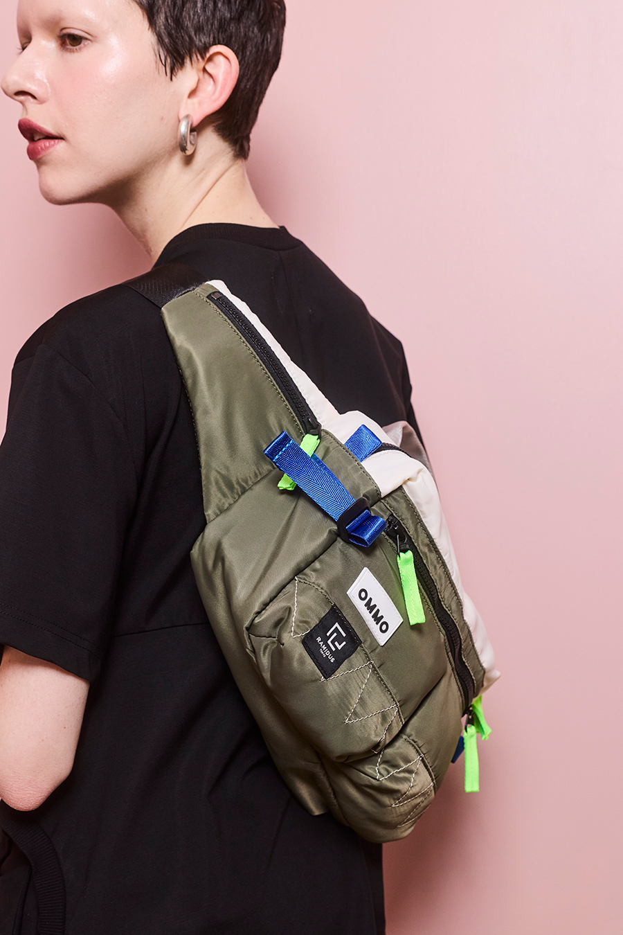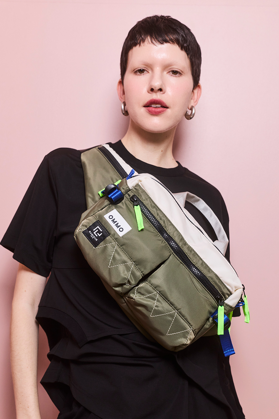 RAMIDUS×OMMOコラボレーションアイテムのウエストバッグ。フロントポケットのMA-1ディティールのステッチや、KHAKIのOMMOらしい配色がポイントになっております。