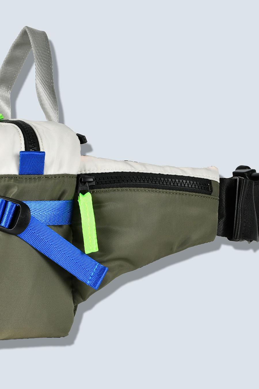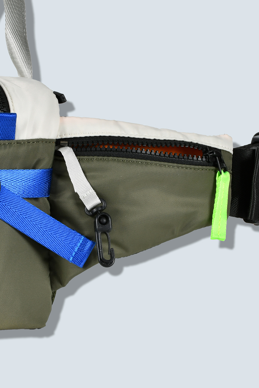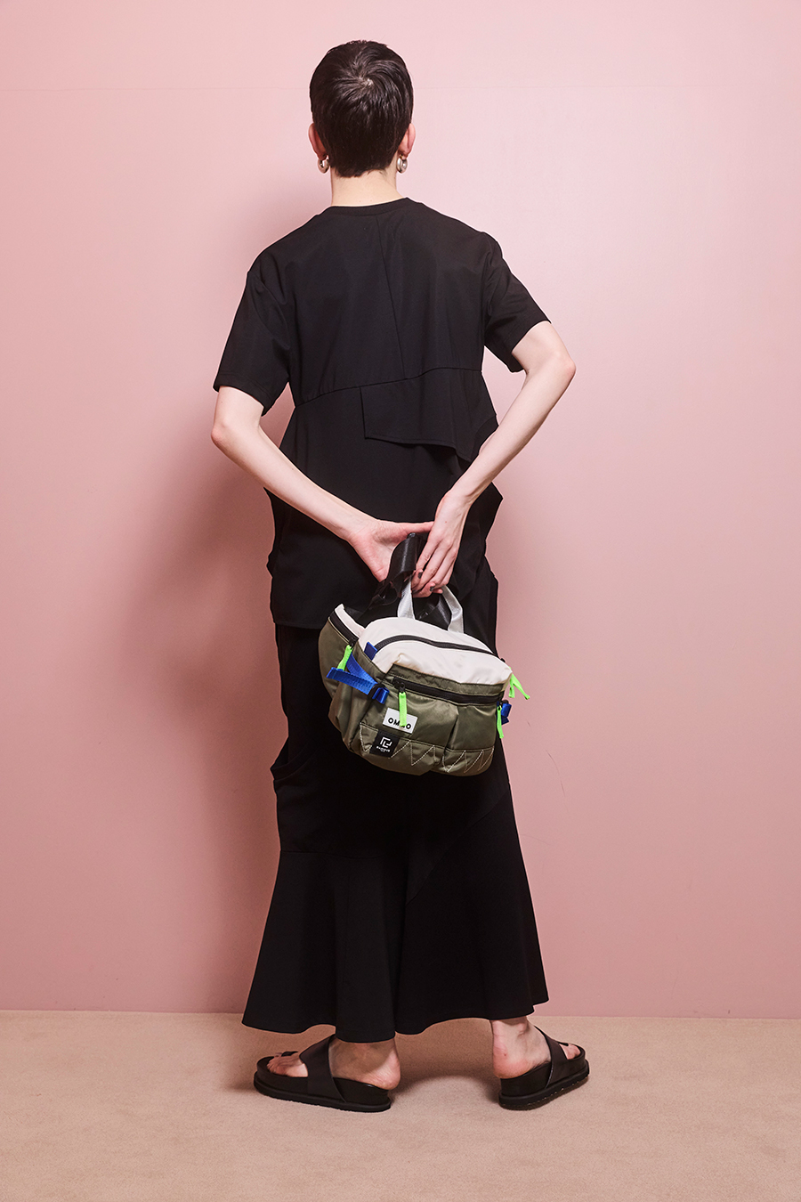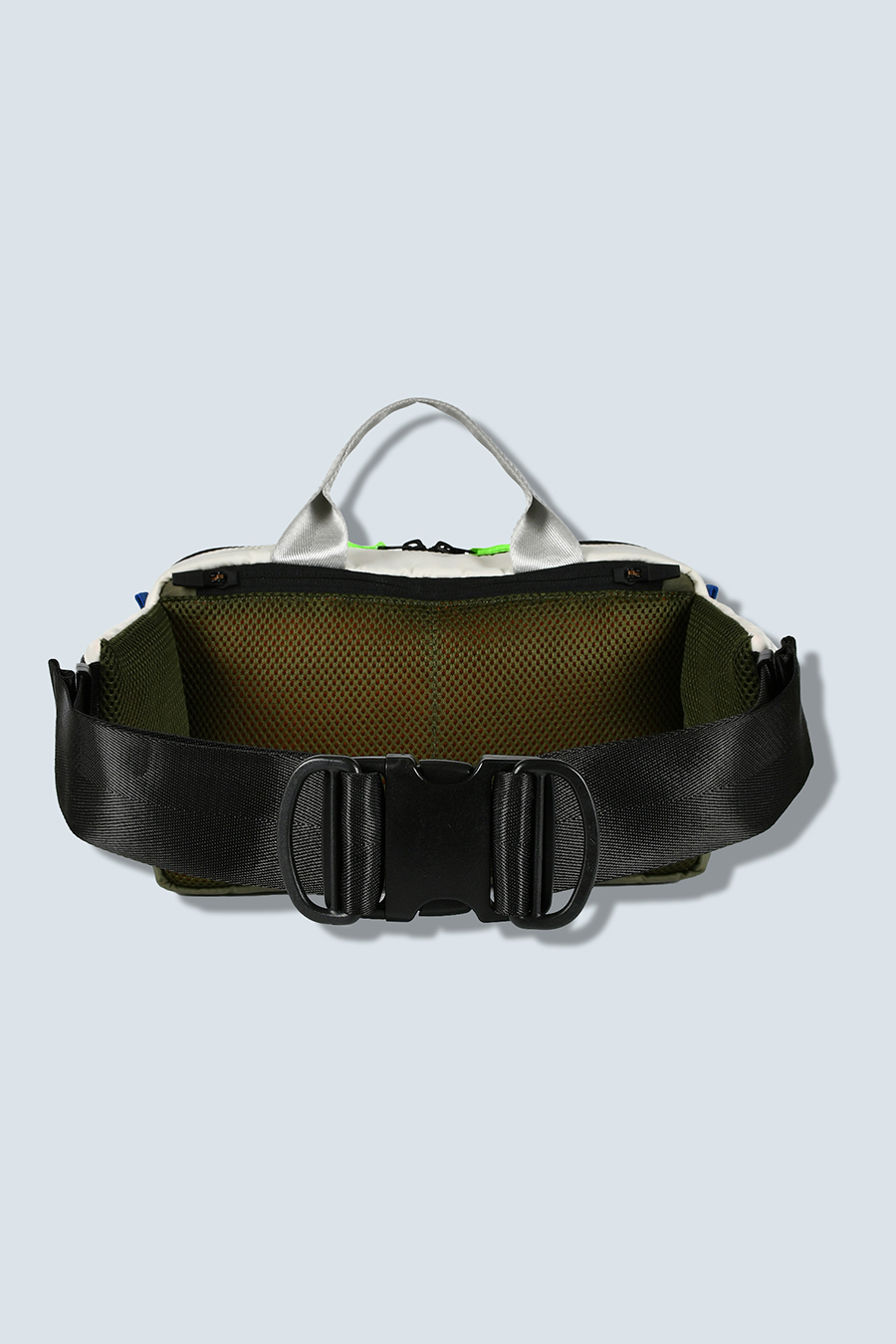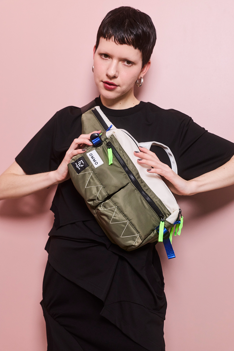 RAMIDUS×OMMOコラボレーションアイテムのウエストバッグ。フロントポケットのMA-1ディティールのステッチや、KHAKIのOMMOらしい配色がポイントになっております。