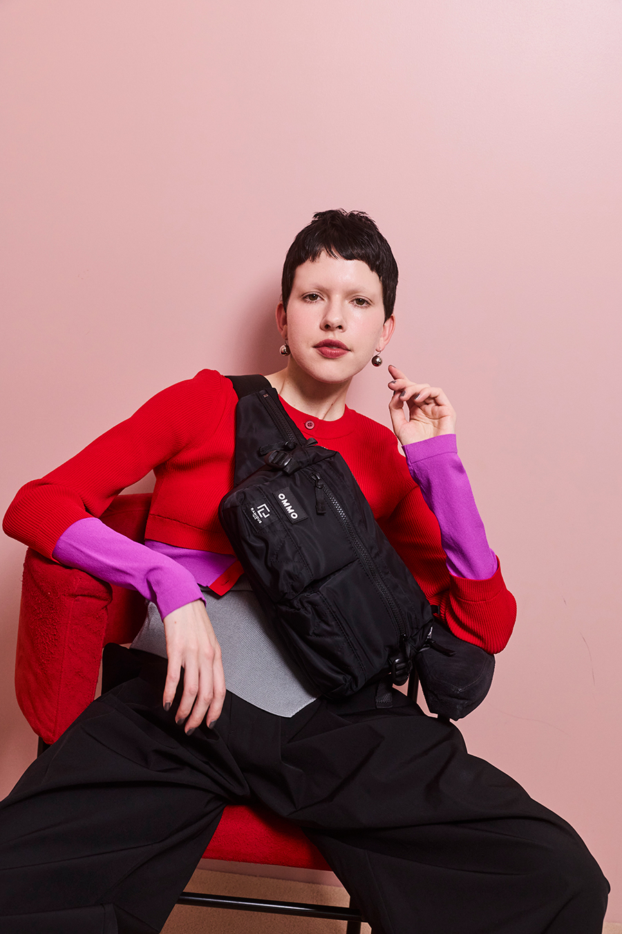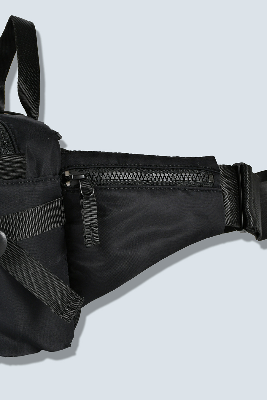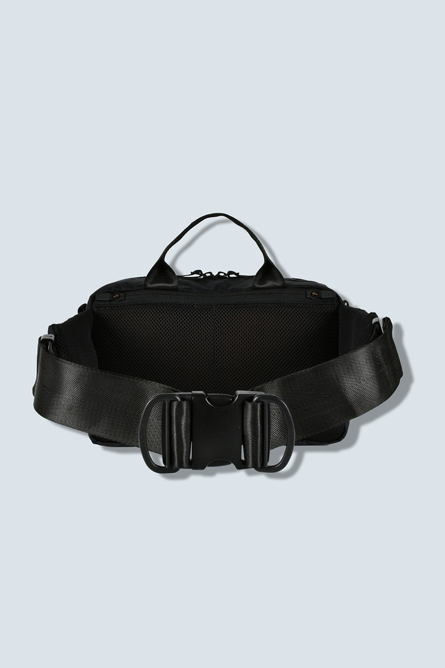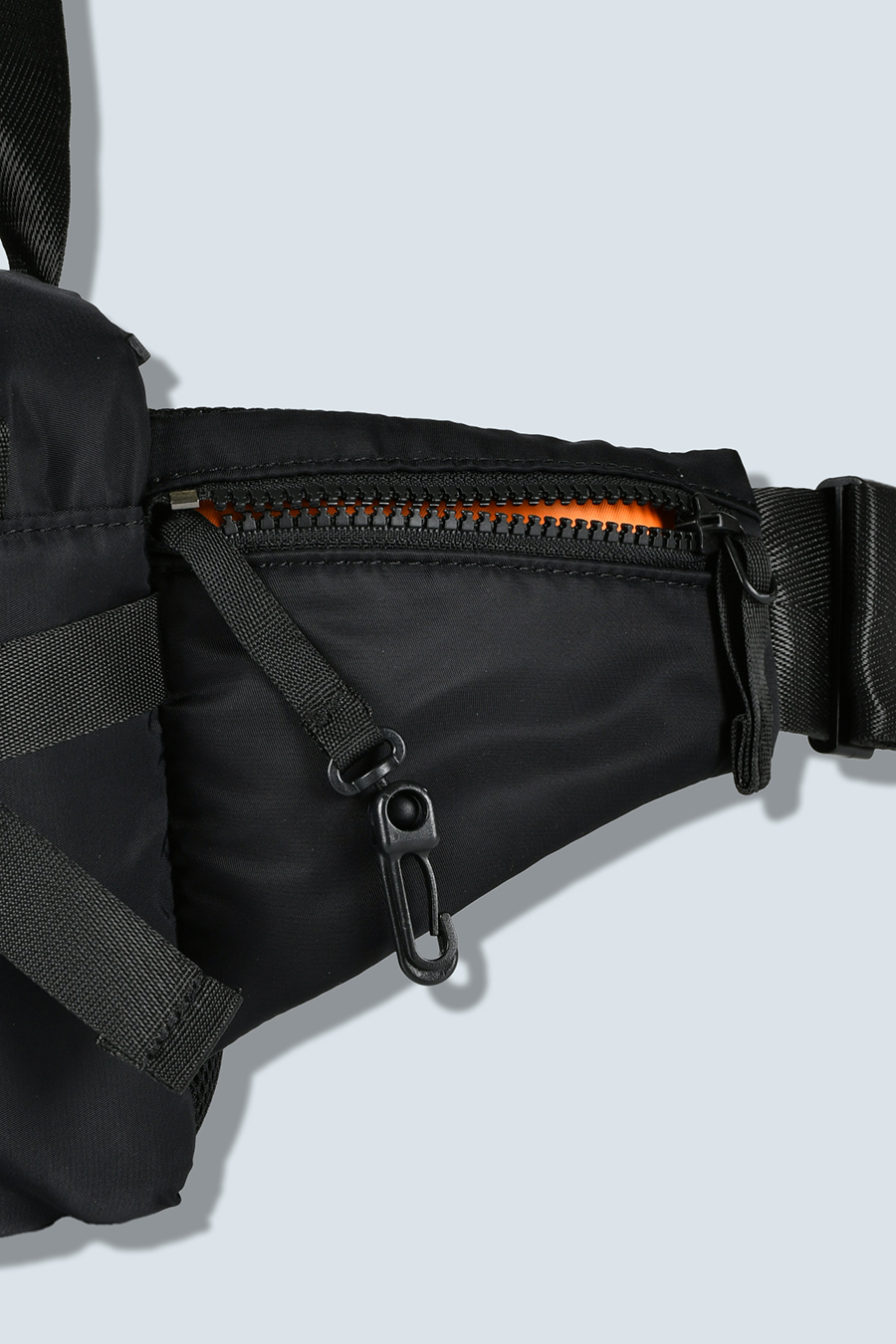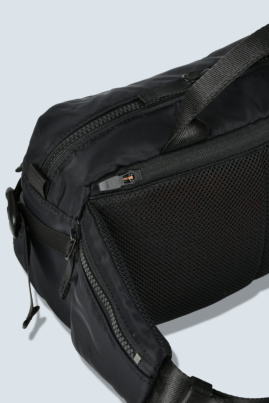 ポケットは合計7つ配置し、上部・正面・背面にはダブルジッパー開閉のポケット、内装にはスロットポケットを2つ、サイドのジッパーポケット内側にはキーリングを備えています。