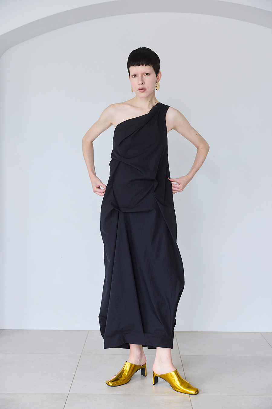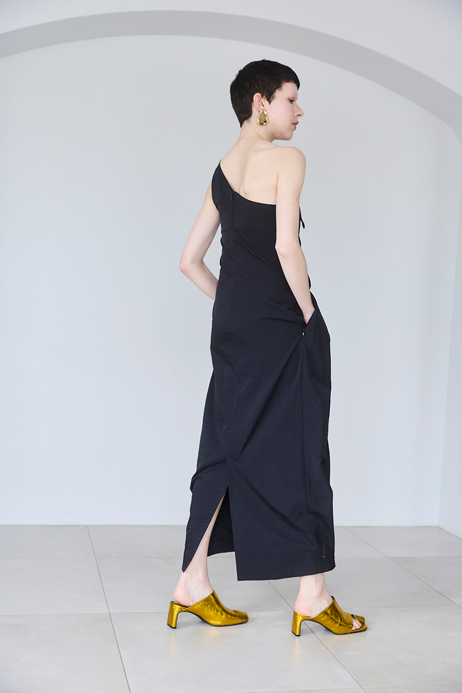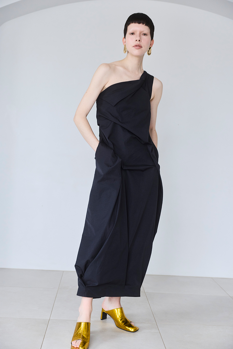 イレギュラータックが生み出す立体感で、フィット感がありながらも体型を程よくカバーしてくれるワンショルダーワンピース。微光沢のツイル生地を使用することで、上品な印象に。