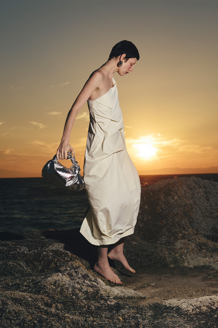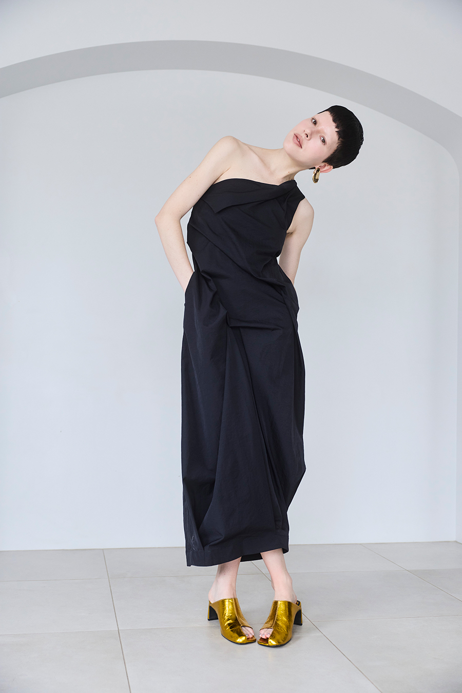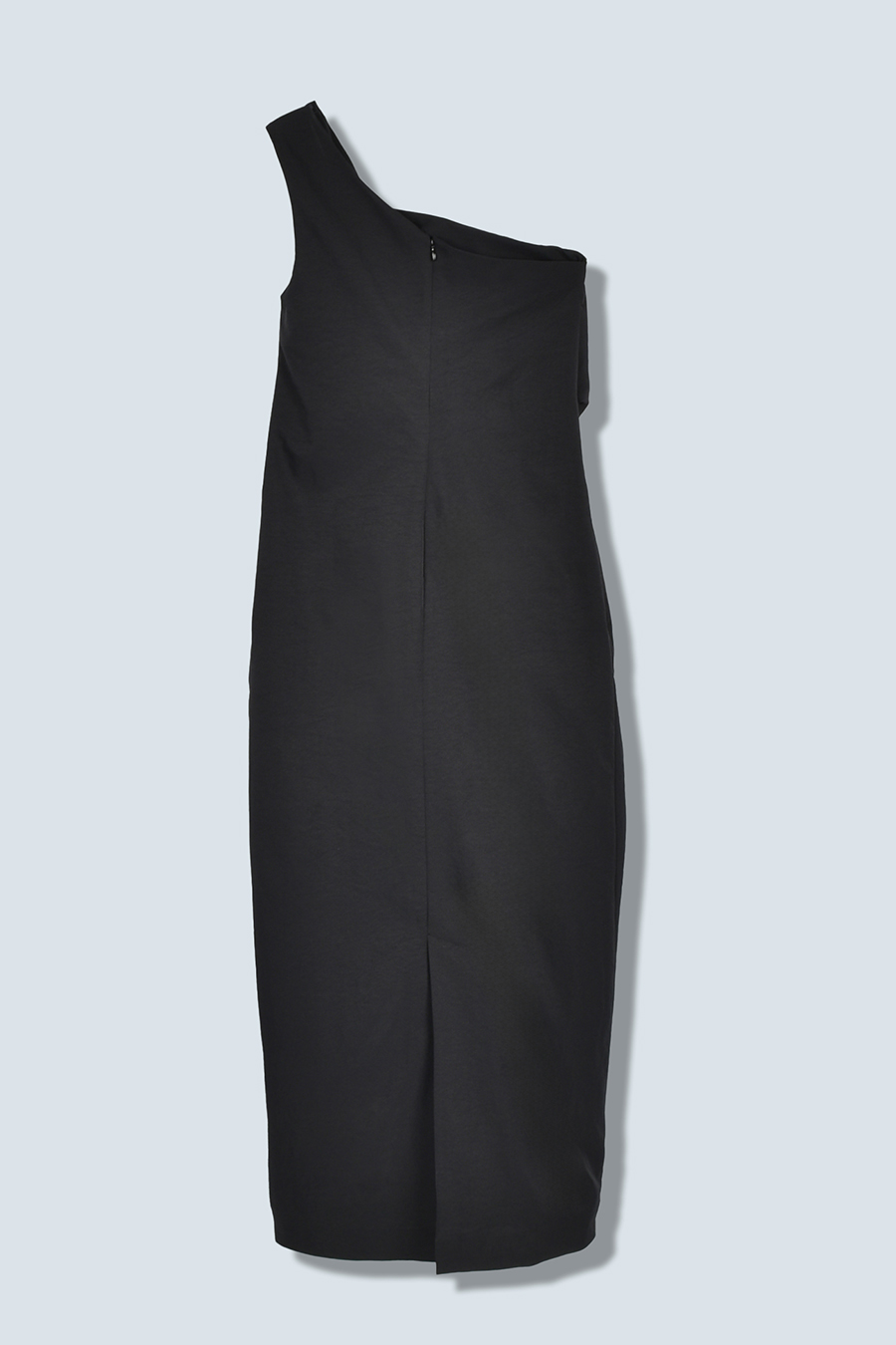 イレギュラータックが生み出す立体感で、フィット感がありながらも体型を程よくカバーしてくれるワンショルダーワンピース。微光沢のツイル生地を使用することで、上品な印象に。