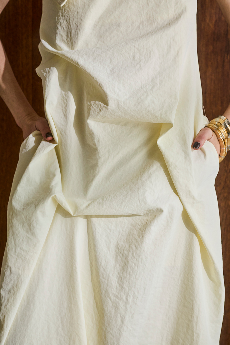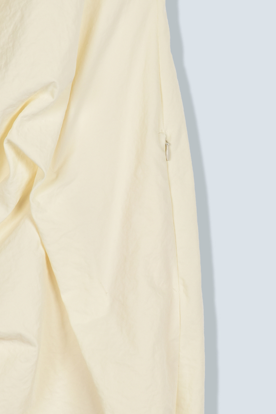 後ろ中心に着脱用のファスナーを備え、両脇にはポケットを配した仕様です。